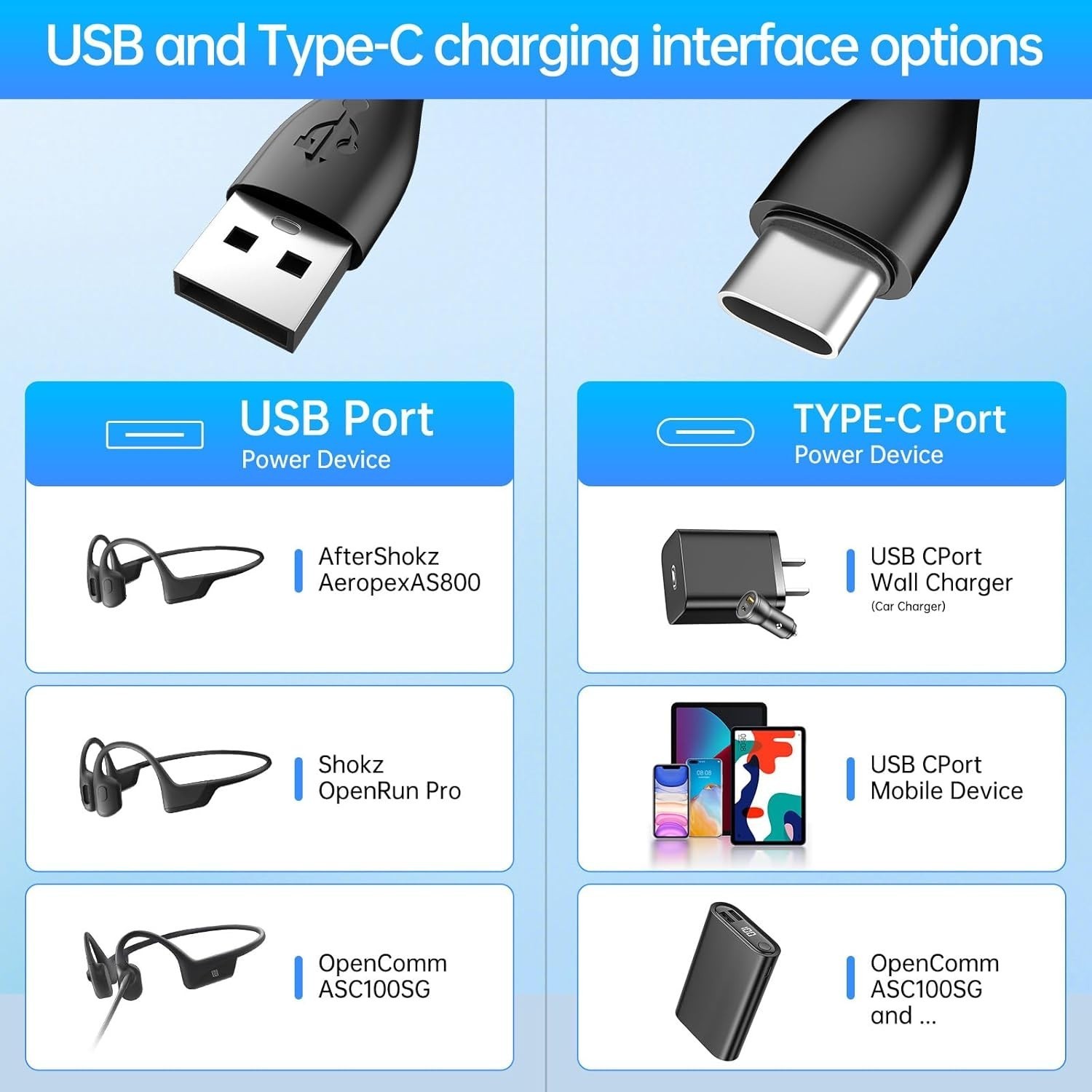 :USB/Type-C Charging Cable to Aftershokz Aeropex As800, Aftershokz Opencomm Asc100sg, Shokz Openrun Pro, Shokz Openrun, Shokz Openrun Mini (aftershokz Aeropex Mini), Openrun Pro Mini;Please check your headphones model before purchase