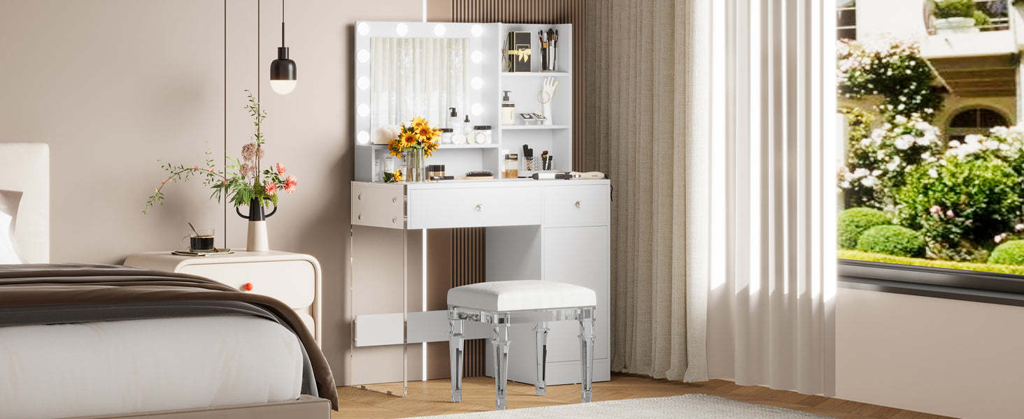 Ample Storage Space: Equipped with 2 drawers, 1 cabinet with adjustable partitions, and open storage shelves, this vanity offers plenty of space for skincare products, jewelry, cosmetics, and makeup tools. Keep everything organized and easy to access.