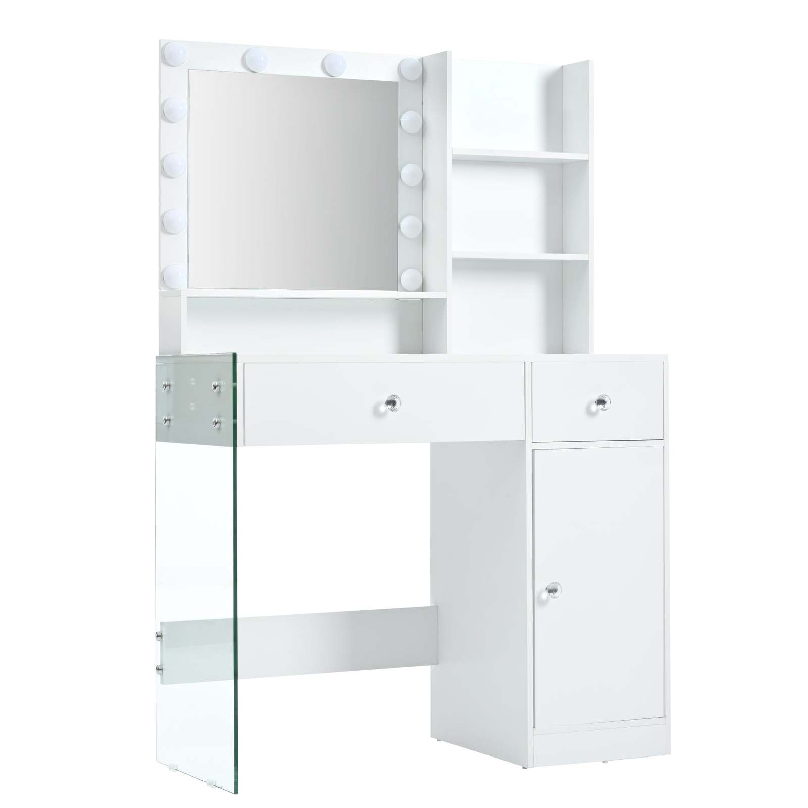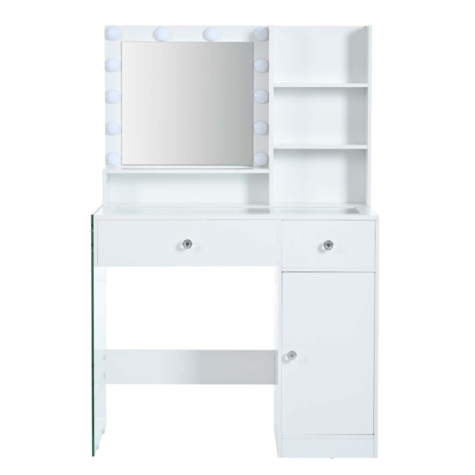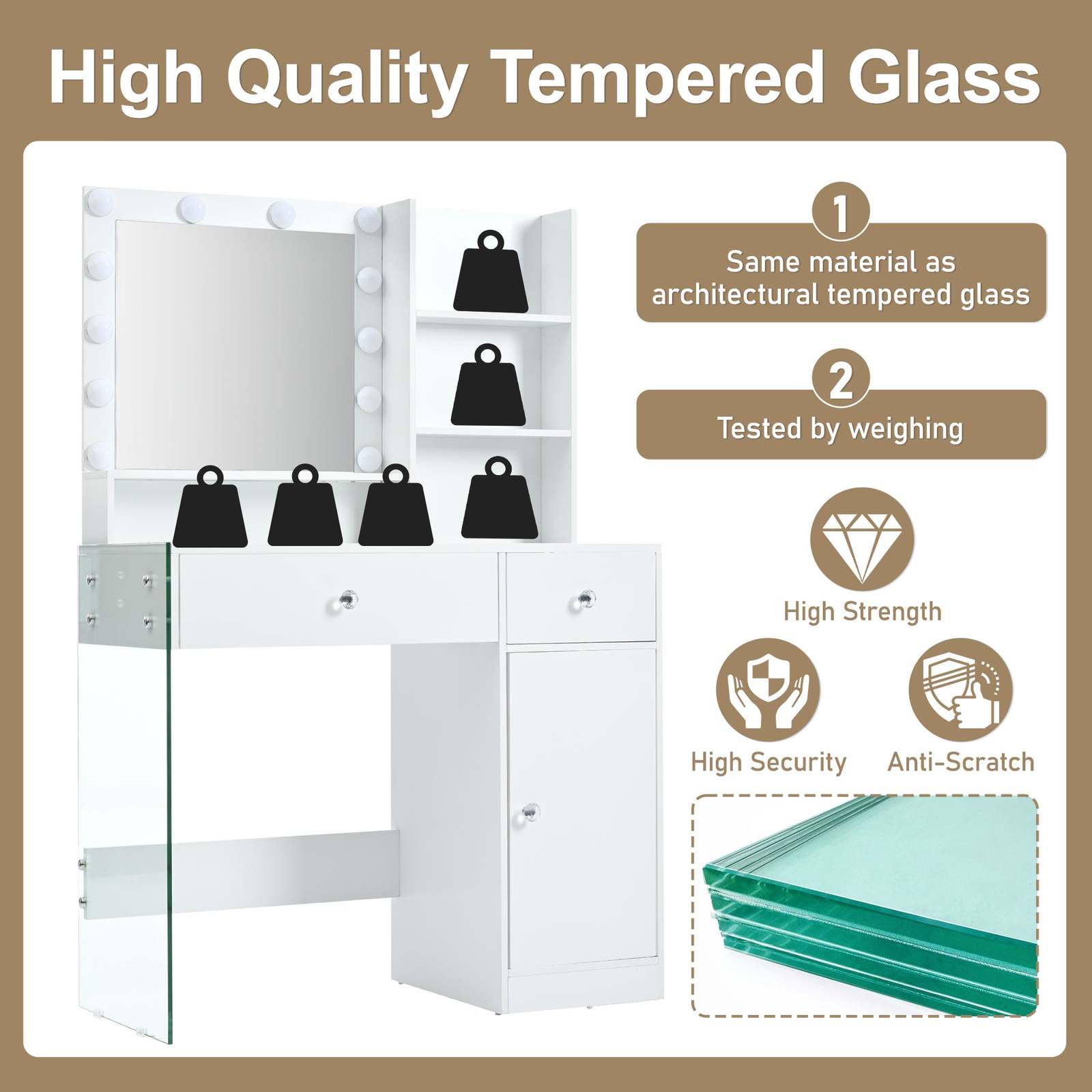White Makeup Vanity Desk w/Mirror, 3 Light Modes, Glass Top & Storage
