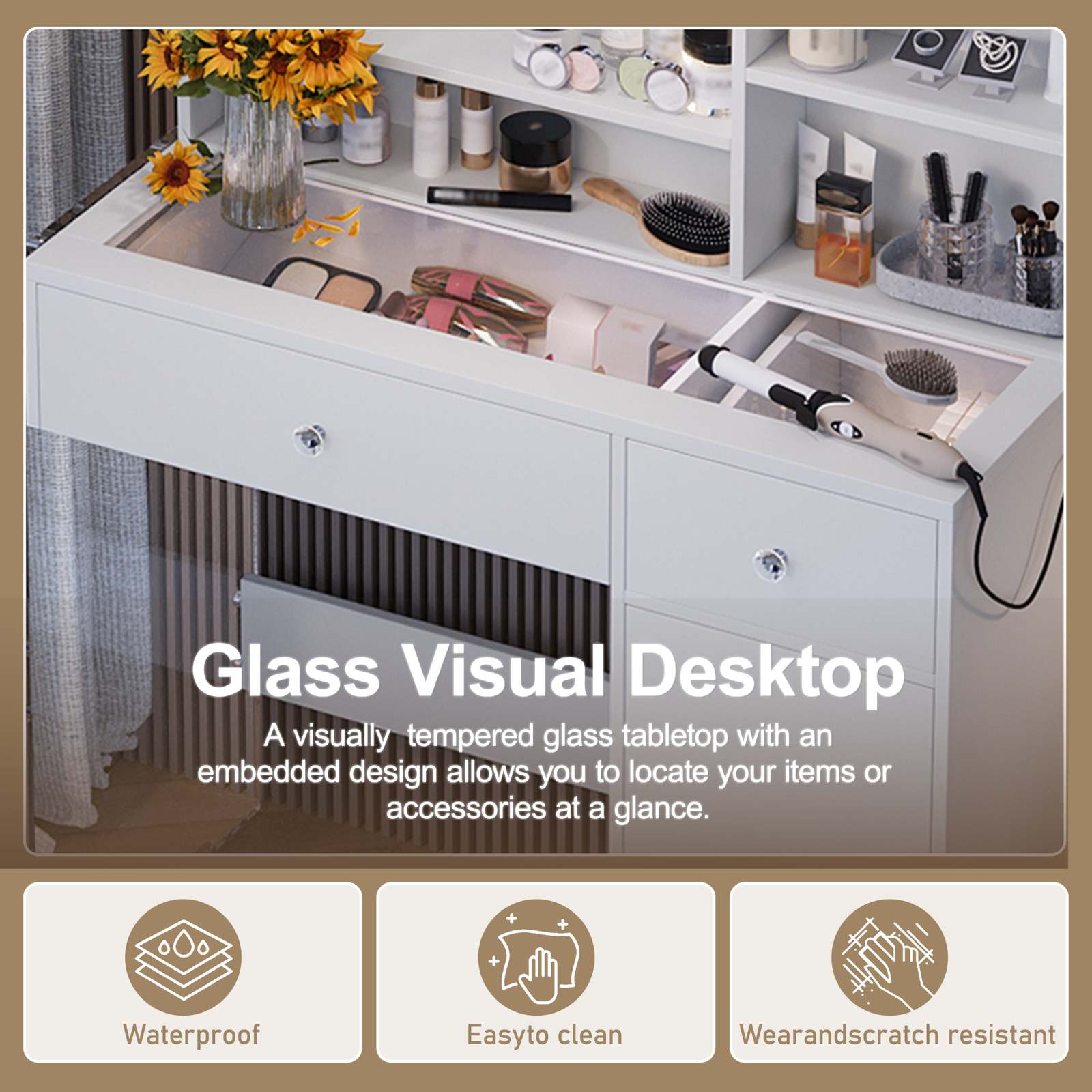 Glass Top: The tempered glass surface not only provides ample space for your beauty essentials but also allows you to clearly see items stored in the drawers, keeping your cosmetics and accessories organized.