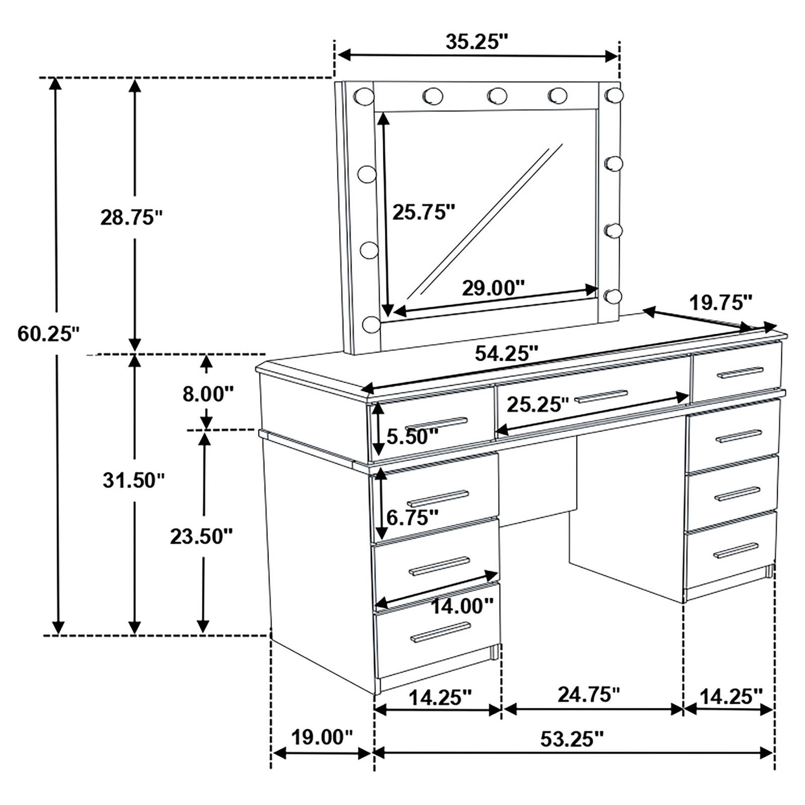 Hollywood style lights add a glam sensibility to the glossy white finish of this vanity desk and mirror set. Spacious drawers are felt lined to keep products and tools protected while the clean, airy lines of the desk complement a wide range of dressing spaces and bedrooms.