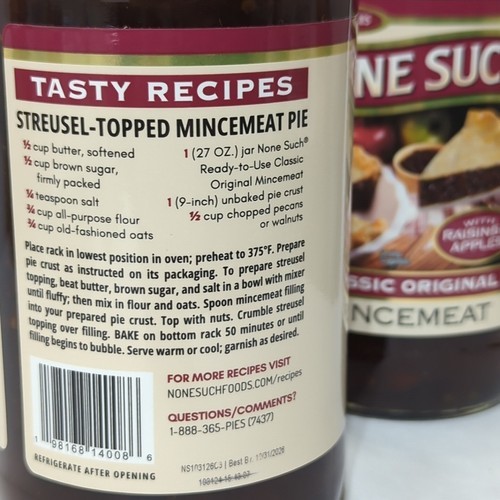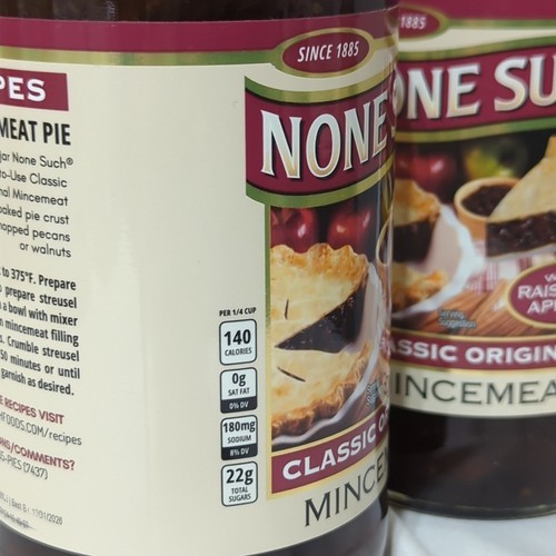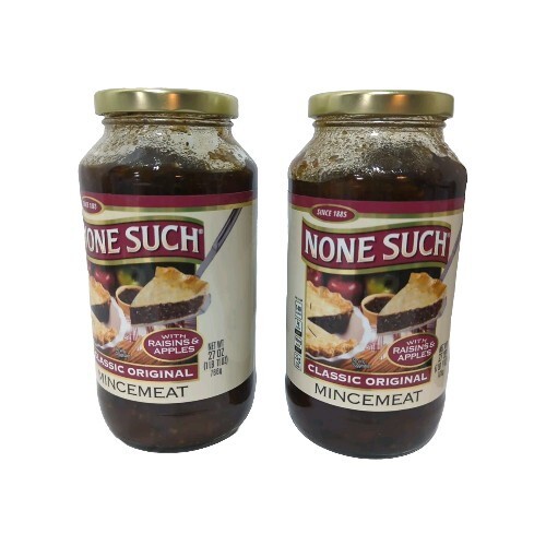 Bake rich, nostalgic desserts with this Lot of 2 NONE SUCH Classic Original Mincemeat Filling Jars. Each 27 oz jar is packed with a delicious blend of raisins, apples, and spices, perfect for traditional mincemeat pies, cookies, bars, and holiday recipes.