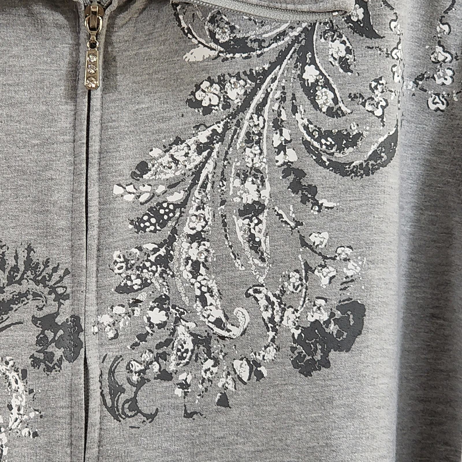 Threehearts Womens Gray Collared Zip-Up Jacket With Pockets. Rhinestones Floral Design