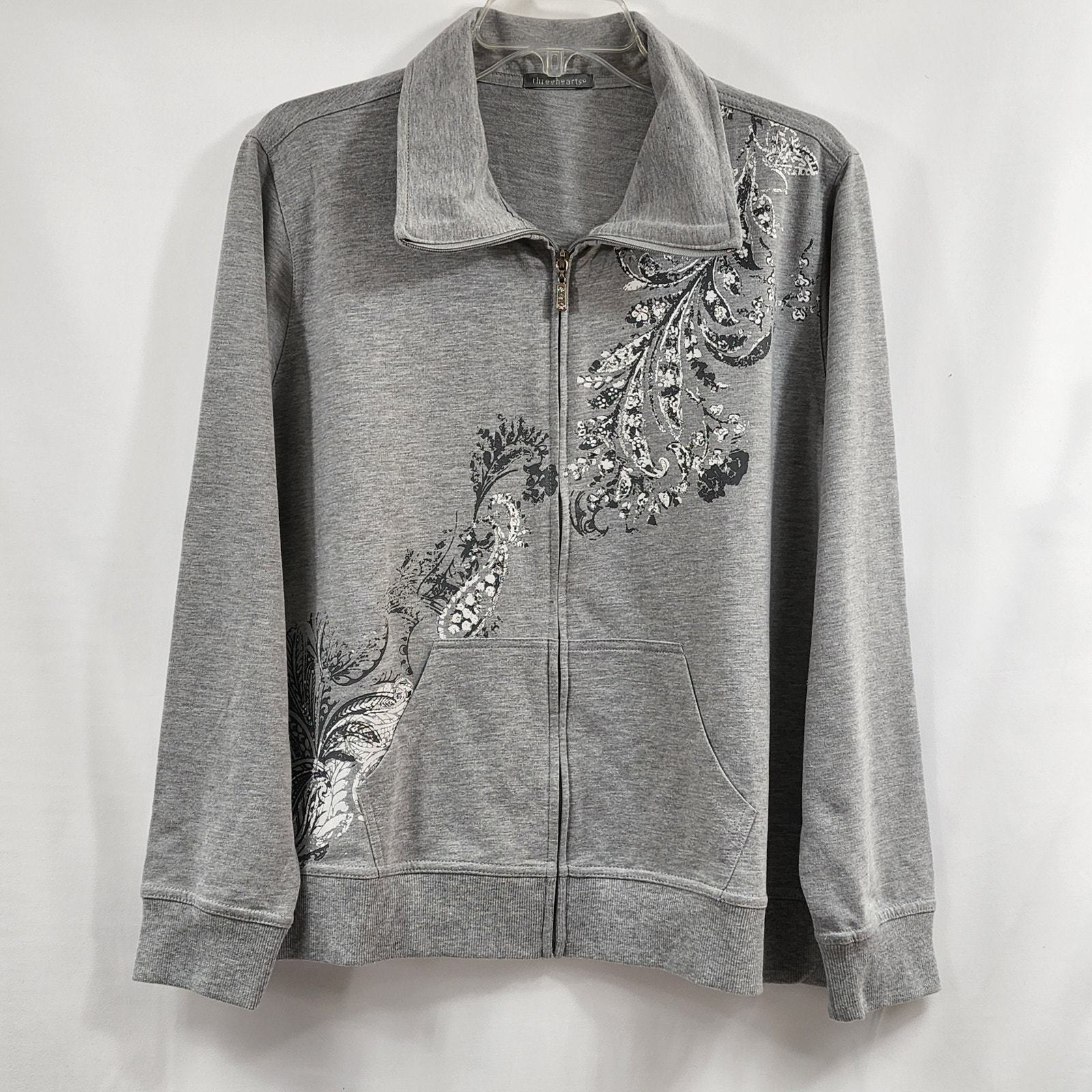 Threehearts Womens Gray Collared Zip-Up Jacket Pockets Rhinestones Floral Design