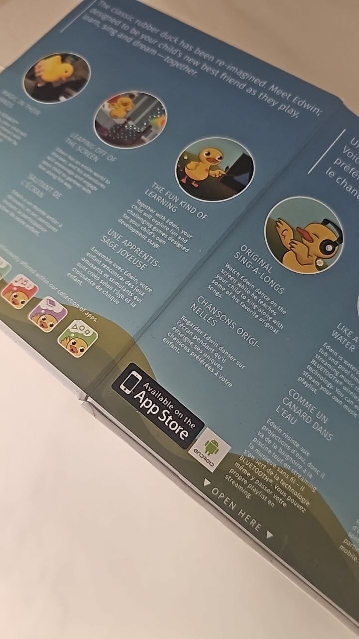 Edwin is water-resistant and acts like a traditional floatable, submersible rubber duck in the tub. He even glows red if the water is too hot.