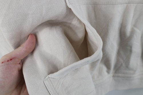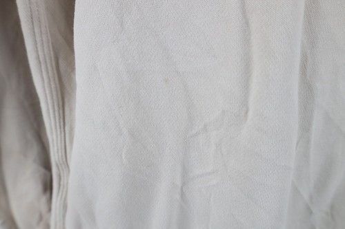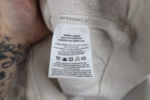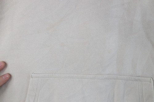 Stains front, back, arms. Hood, cuffs discolored. Graphics, color faded. Pilling