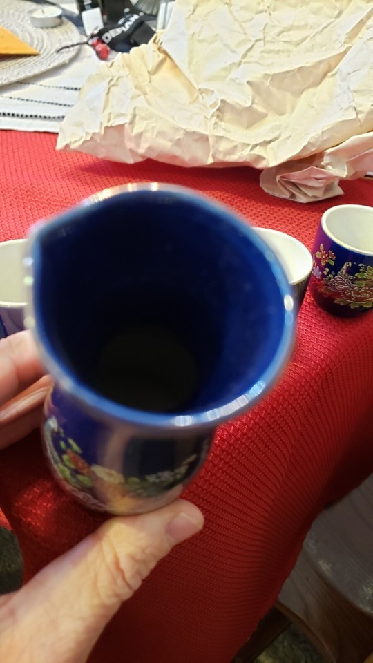 c'est un ensemble genial. Vous obtenez 4 petites tasses (contiennent probablement 1 a 1,5 once) et le pichet. J'ai obtenu cela lors d'une vente de propriete aupres d'une riche dame agee qui a voyage dans des terrains asiatiques dans les annees 80. Tous ses objets dataient de 1990 ou d?avant. Je ne connais pas l'age exact de ceux-ci.