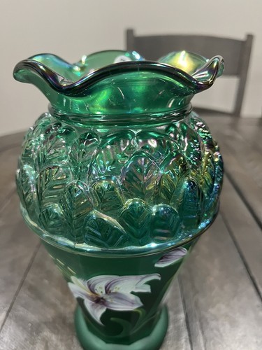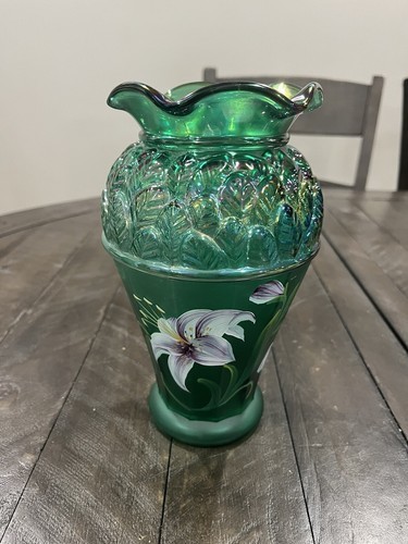 This beautiful vase from Fenton's Designer Series is a must-have for any glassware collector. The emerald green body is accented with iridescent purple lilies, making it a stunning piece of art. The vase is made of high-quality glass and crafted using studio techniques, ensuring its durability and uniqueness.
