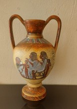 This is a beautiful hand-painted Greek ceramic amphora vase featuring an ancient-style mythological scene. The artwork depicts figures in classical attire, reminiscent of traditional Greek pottery.