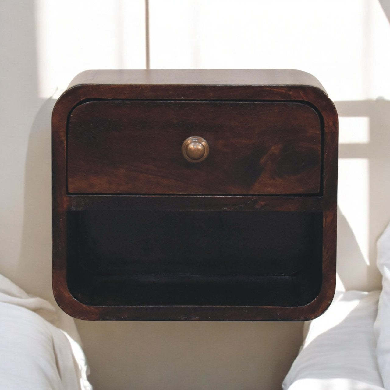 Inspired by our curved range, this minimalistic mini wall-mounted unit has been constructed from 100% solid mango wood in a california walnut finish and features 1 drawer and 1 open slot. This piece is perfect for storing any bits and pieces you wish to keep close by before bedtime. Its neat and clean design can easily be mounted on the wall without the fuss of any legs. Caution! Do not sit on the unit.