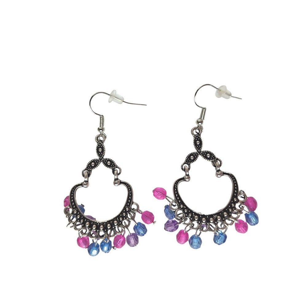 Vintage-Style Silver Chandelier Earrings With Pink & Blue Faceted Beads