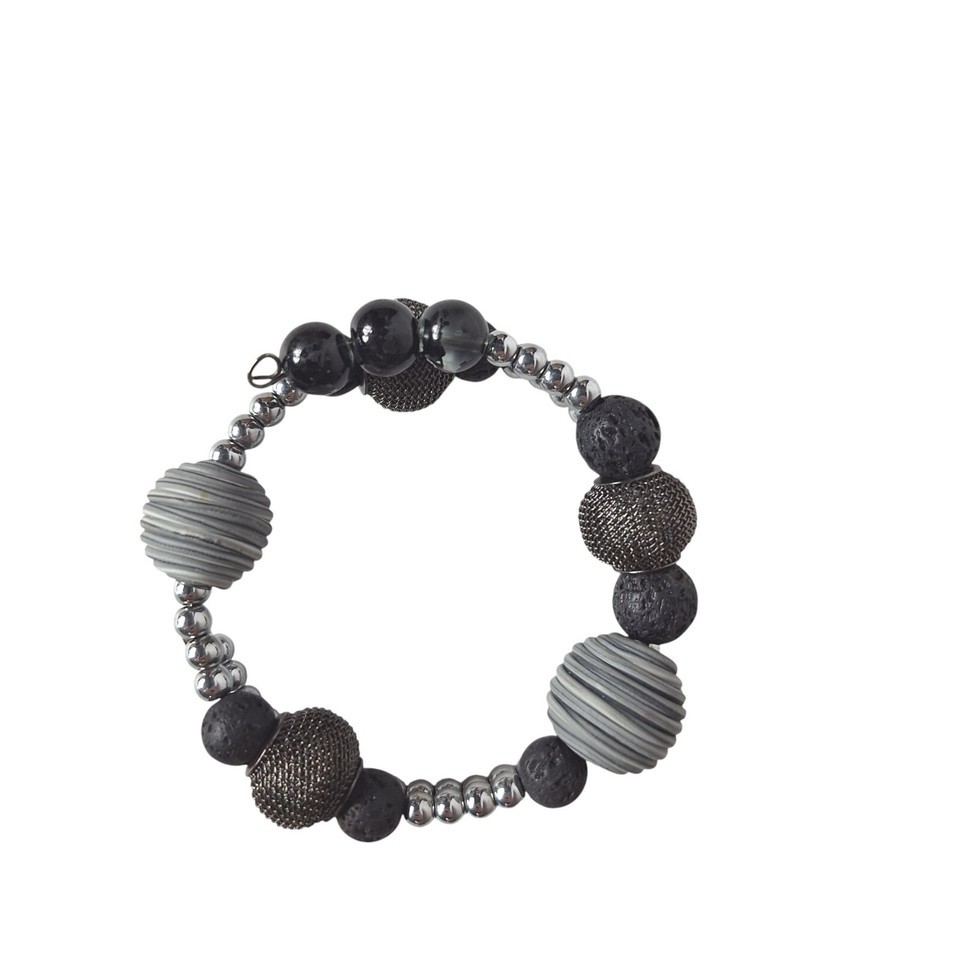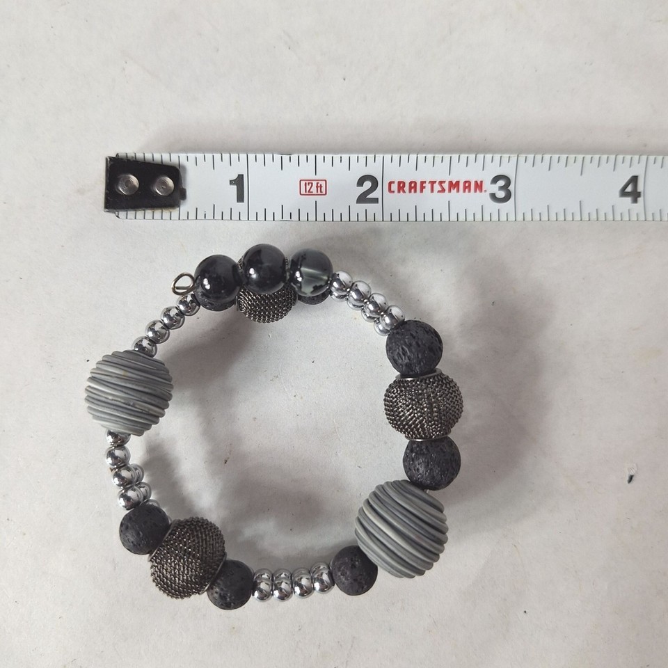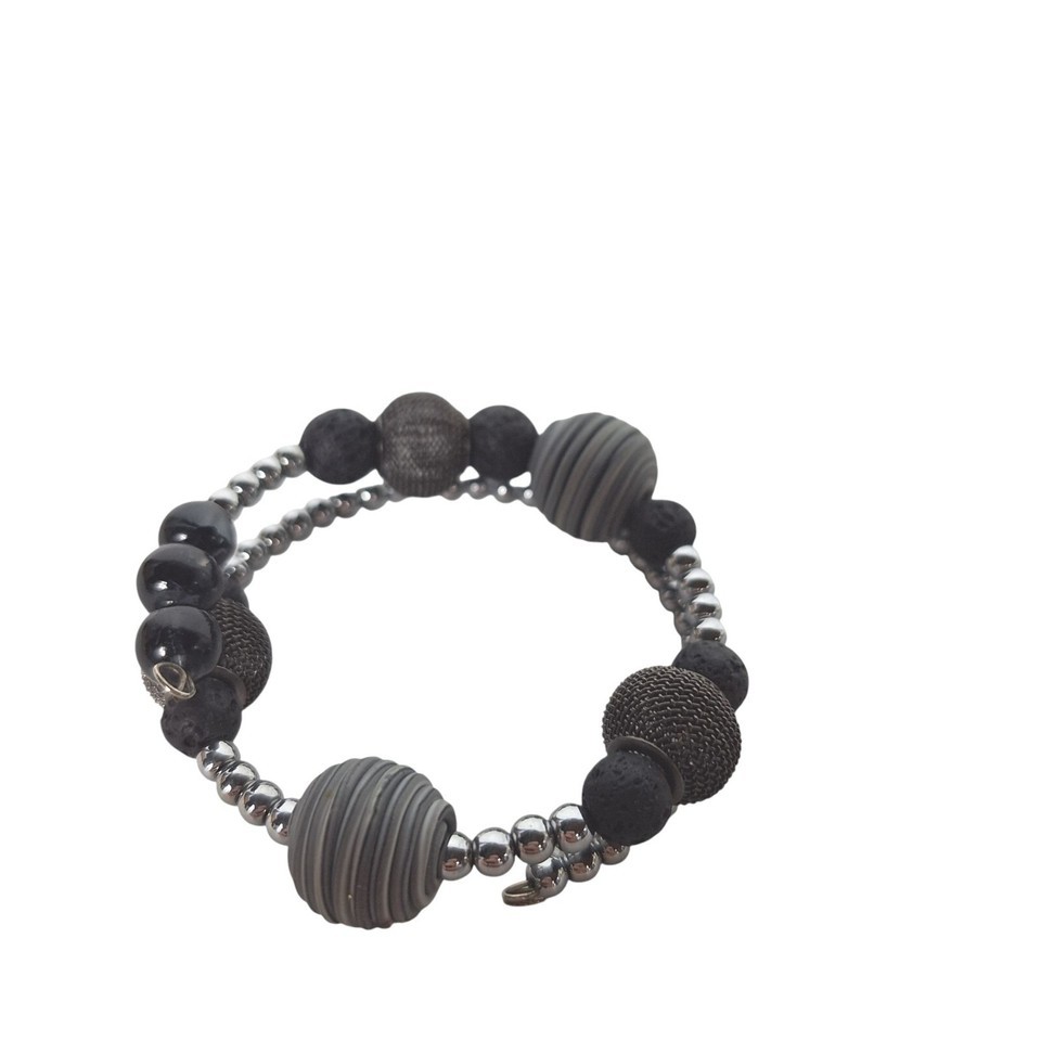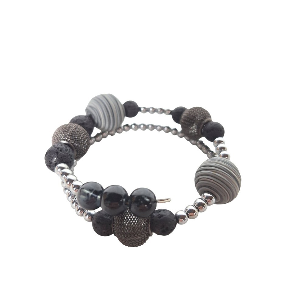 Black Silver Textured Mesh Metallic Shiny Beaded Wrap Bracelet Costume Jewelry