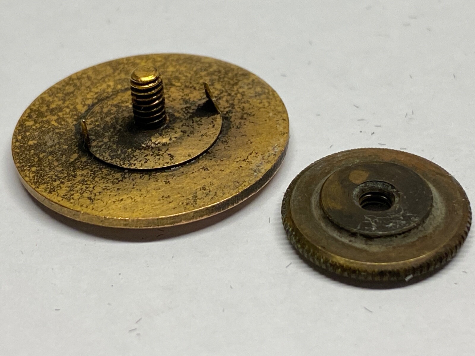 Type 1 Collar Discs were issued from 1910 until 1926. They were primarily issued in a bronze finish and used a screw nut to attach to the uniform. The left collar disc could contain the Regiment number and Company Letter, or number/letter combinations for special assignments. The left disc could also include the regiment number and company letter. To simplify disc production as mobilization for WW1 progressed, the Regiment number was moved to the right disc with the Company letter on the left disc. As mobilization continued and the number of units increased, both letter and number were dropped. Six background patterns have been identified but are considered manufacture variations. Army Regulations issued on October 14, 1921 stated that collar disks were to be bronze on service uniforms and gilt on white uniforms. On November 25, 1924 the bronze disks were dropped.