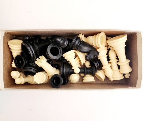 32 authentic plastic Staunton design Chess Men pcs. 16 of each color complete. Less than typical wear. Not much use or wear for their age.