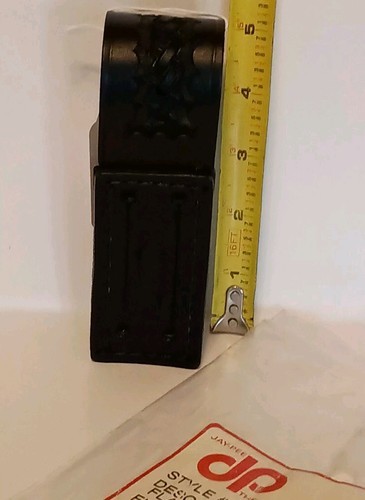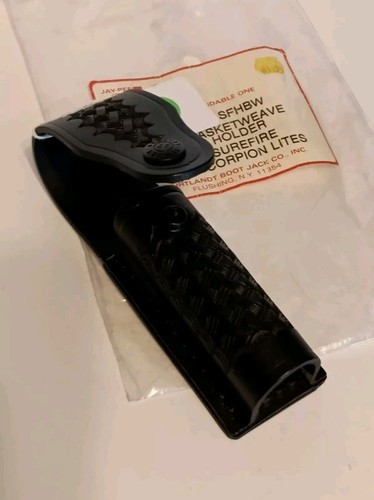 The Jee-Pee Pouch in black is a flap style holder made of lightweight leather, designed to fit Surefire and Scorpion lites. It features a basket weave design and is medium in size, suitable for hunting activities. This tactical molle pouch is ideal for securely holding and carrying essential items during outdoor pursuits. Item is new old stock with some wear to the packaging.