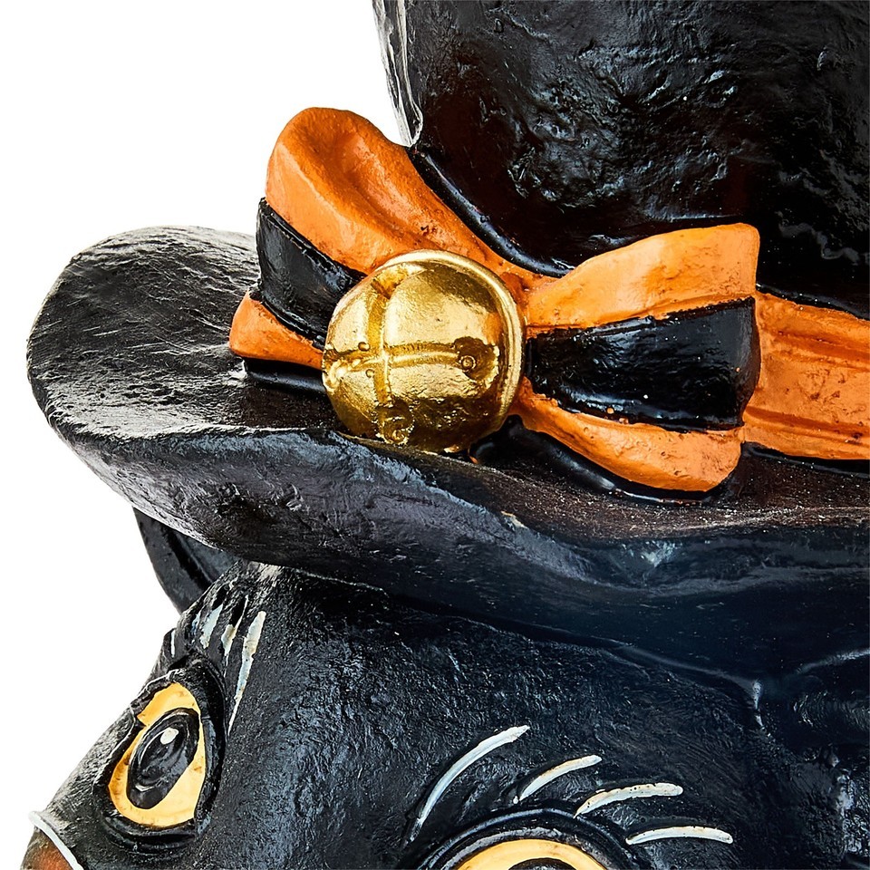 Way To Celebrate Halloween Resin Vintage Cat Tabletop Decor, Black and Orange, 10" Features a smiling black cat with a top hat and bow tie Classic black and orange color scheme with gold accents Measures 10 inches tall, perfect for tabletops or mantels Crafted from durable resin for a sturdy, vintage look Adds a whimsical, retro touch to Halloween decorations