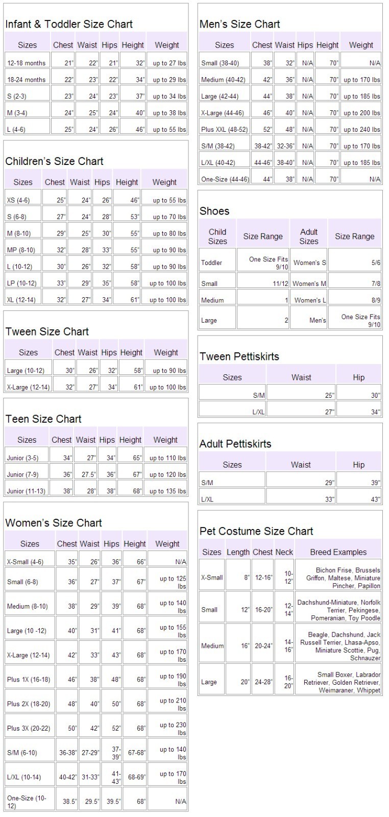 NOTE: Listing is for items listed as included only. Some accessories may be pictured but are not included. All are new in package. Costumes may have some wrinkles or creases from being folded or in package, please see care instructions before trying to iron, etc. A quick and easy way to help eliminate wrinkles is by using a spray bottle form of fabric wrinkle releaser (not included). New in package items may have long / loose threads or strings that may require trimming, these are not considered defects. For Costumes, please refer to chart in this listing as reference for estimating size, always choose a size larger if borderline. Individual results will vary. Please note everyone's body is made different and costumes may not fit as they fit the models in the photos. If you are unsure of the size you need or if your in between sizes, please choose the larger size. These are costumes and should fit comfortably. All sizing information is provided by manufacturer in U.S. sizes. International buyers please know size conversions for your country. International buyers purchase sized items at their own risk. Some Features, Packaging, Colors and Texture may vary slightly. Manufacturer may change some Features, Packaging, Colors and Textures so actual costume may vary slightly from picture. Any known differences will be stated in description. Manufacturer's Photo and Actual Photos - Alternate Views. No Returns or Exchanges on Costumes. As is New in Package. Exact colors cannot be guaranteed. Monitors and screens display colors differently, please keep this in mind. I have no way of knowing what you are seeing. Ships in a polymailer. Hanger will be removed for shipping purposes.