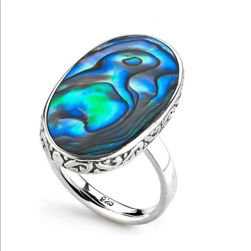 Sterling silver bezel set abalone Balinese oval ring - Approx. 1" L x 3/16" W ring face - Imported