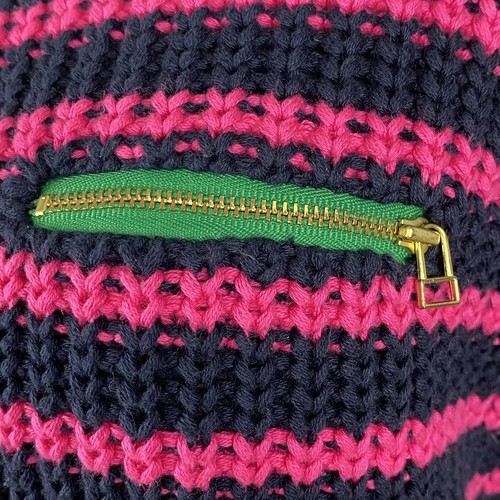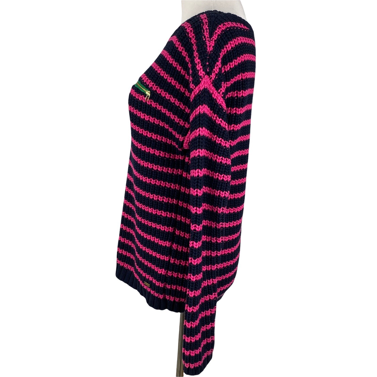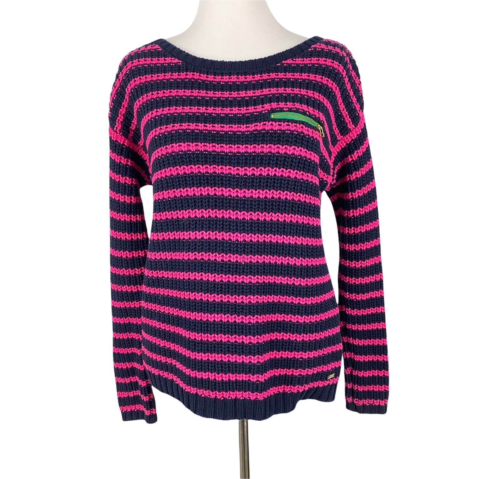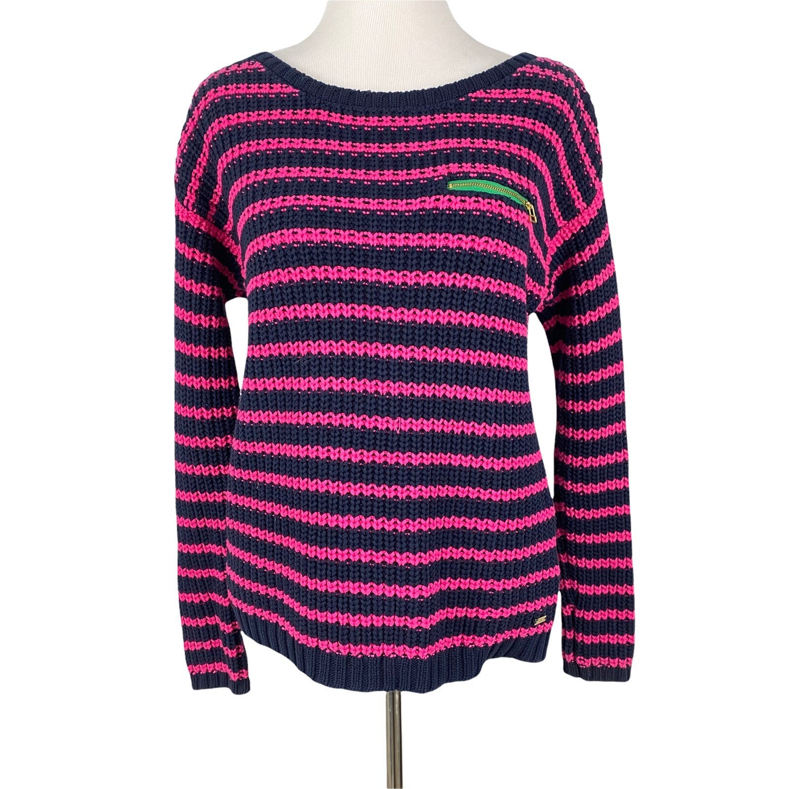 Womens Tommy Hilfiger knit sweater - Navy blue and pink stripes with zipper pocket on chest with gold zipper and green ribbon accents.