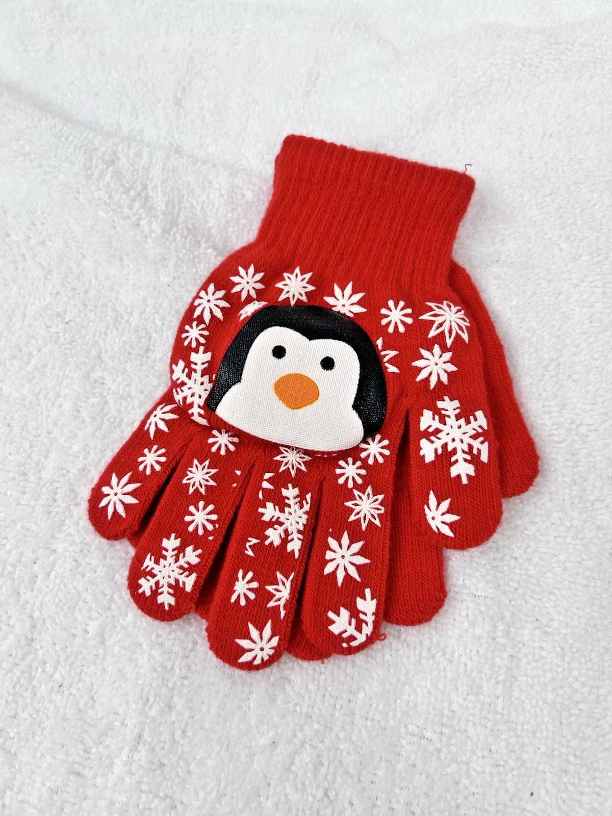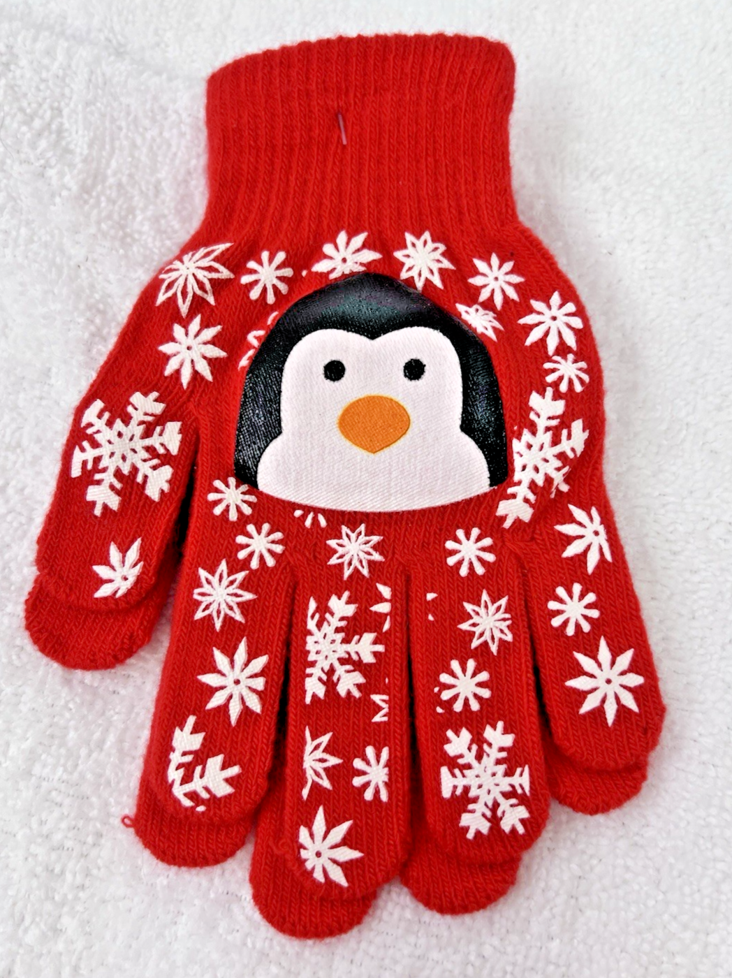 New Penguin Christmas Stretchy Gloves Red with White Snowflakes