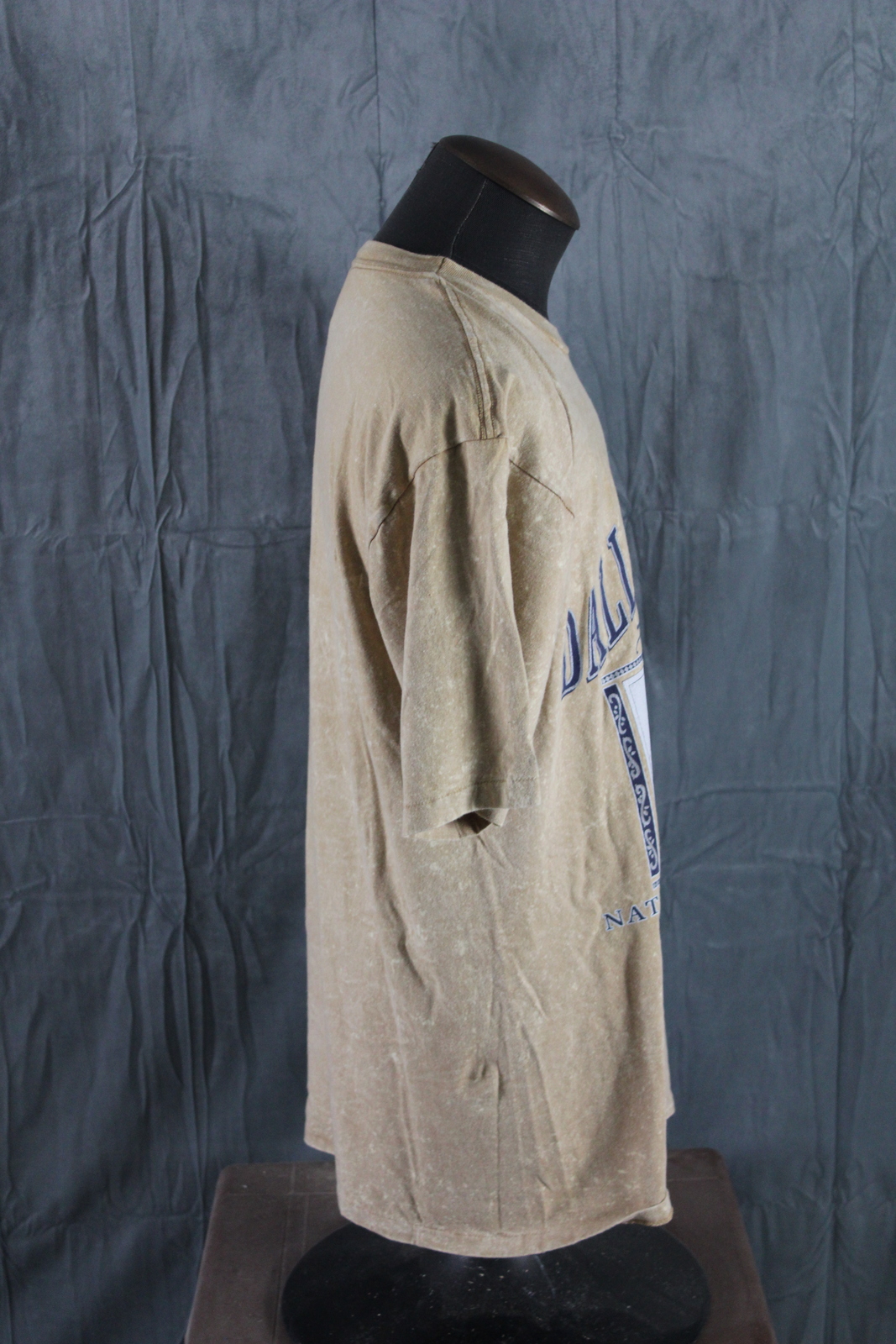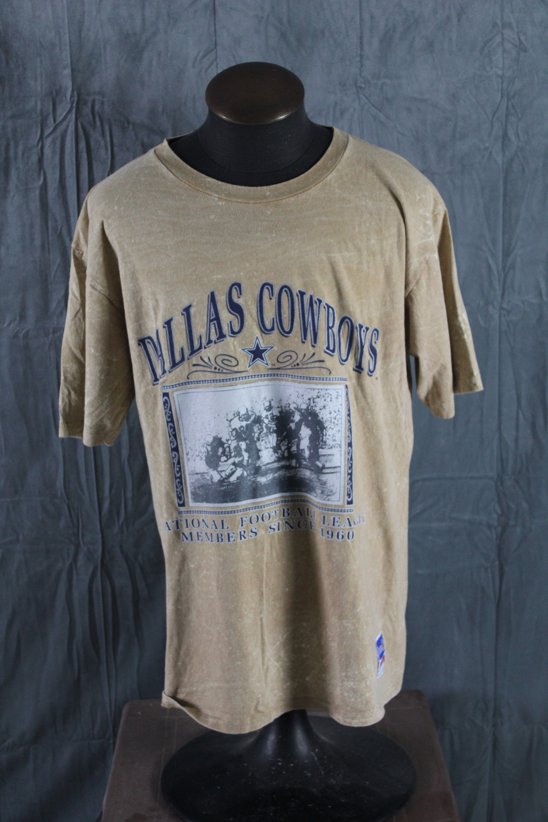Up for sale is a vintage Dallas Cowboys shirt by Nutmeg. It has a beige stone wash base. The front of the shirt has a large grpahic with Dallas Cowboys on top. a vintage football grpahic in the middle and National Football League since 1960 underneath. What an amazing vintage shirt do not miss out on it.