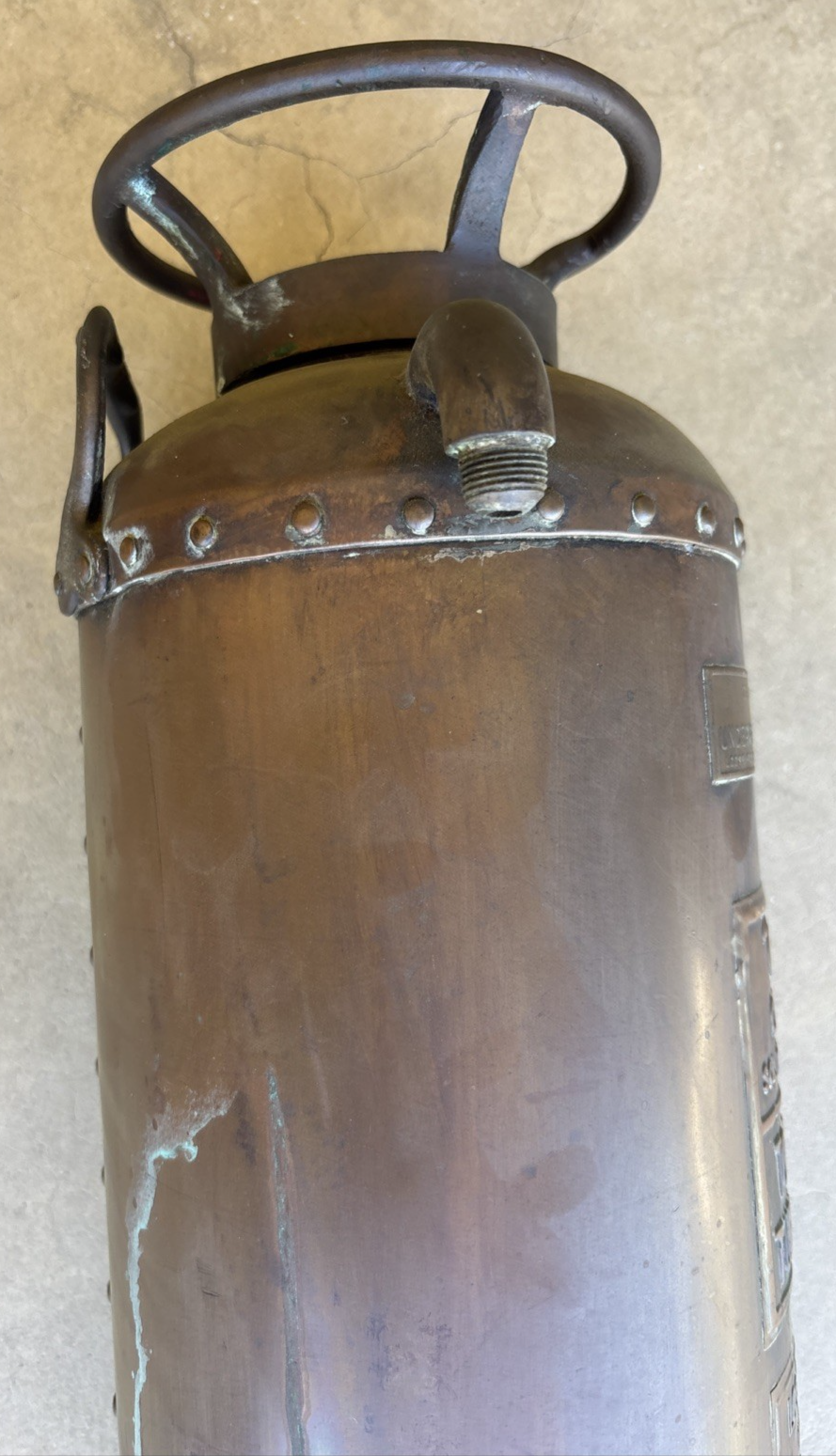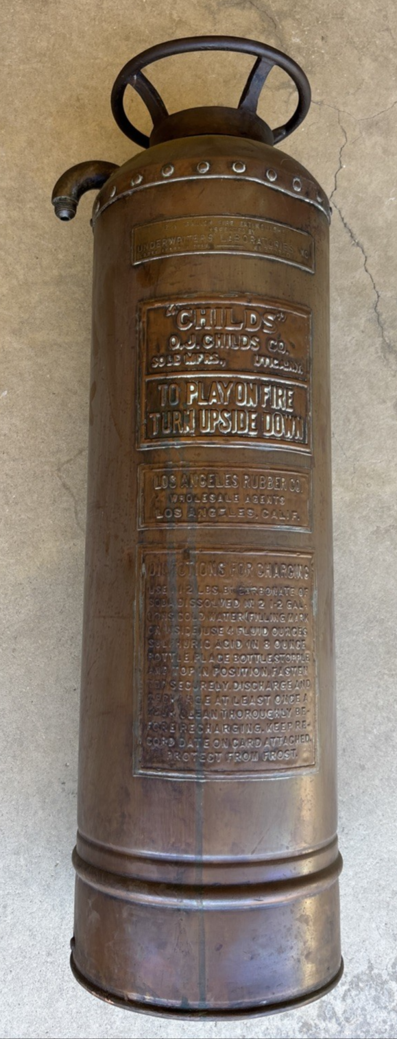 The product is a vintage antique "Childs" copper and brass fire extinguisher, made in the United States. This collectible item is themed around firefighting and rescue, making it a unique piece of historical memorabilia for enthusiasts of firefighting and rescue artifacts. The lack of a signature adds to its authenticity and charm, adding to its appeal as a valuable addition to any collection.sold as is for parts or repair