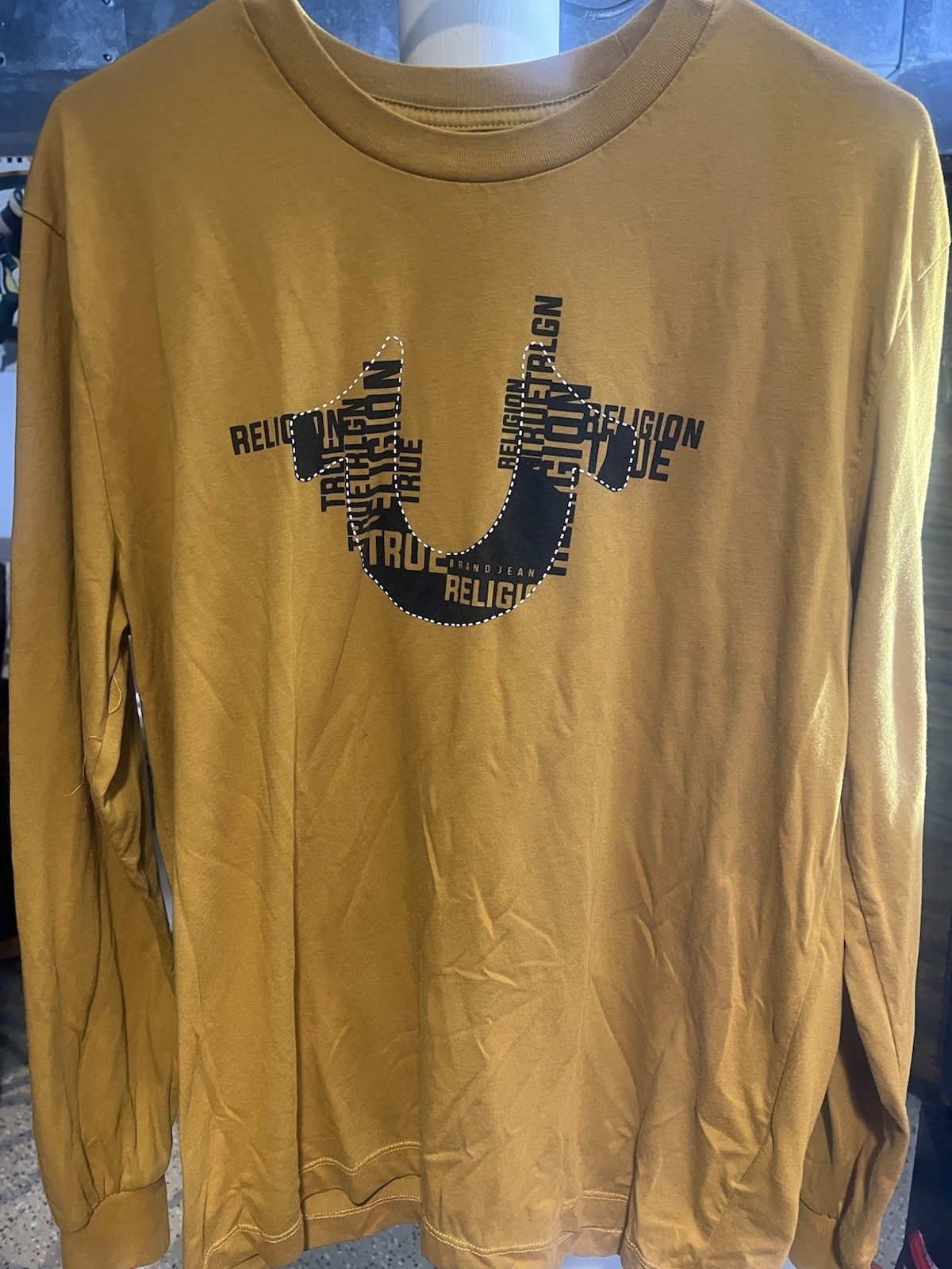 The True Religion Men's T-Shirt is a stylish and versatile addition to any man's wardrobe. Made from soft and comfortable cotton material, this short sleeve t-shirt features a classic crew neck design with a solid gold color and the brand's logo accents. Perfect for all seasons, this designer tee offers a regular fit and is machine washable for easy care. Ideal for summer, fall, and spring, this True Religion t-shirt is a timeless piece that showcases a touch of luxury in a casual and trendy package.