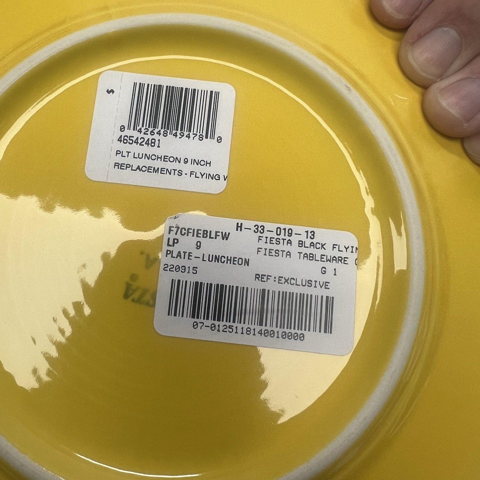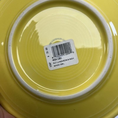 The product is a set of two round 9" ceramic plates from the Fiesta brand, featuring a Halloween theme with a yellow and green color scheme. Made in America, these glossy finished plates are perfect for serving lunch or snacks during the Halloween season. The set includes a "Whoo Owl Boo Witch" design, adding a fun and festive touch to your dining experience. Perfect for adding a touch of whimsy to your table setting, these plates are a charming addition to any Halloween celebration.