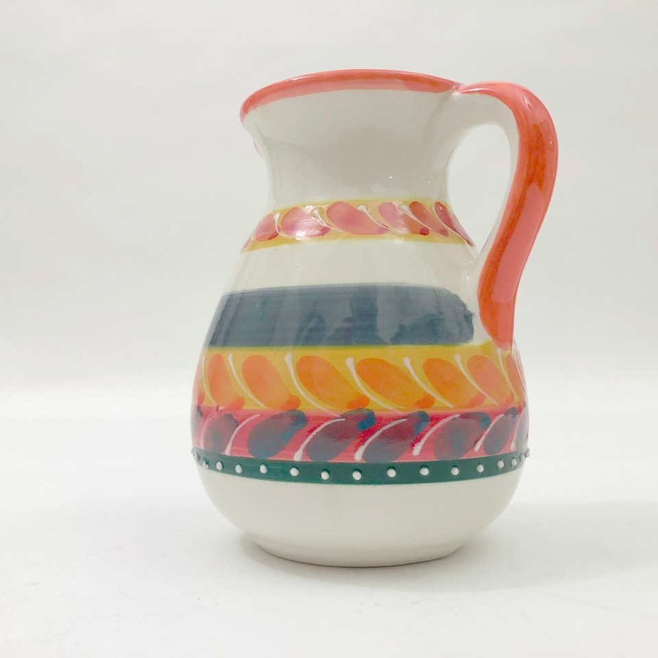 EUC, Excellent Used Condition. Beautiful vintage pitcher was handmade in Spain by HNOS Pedraza. It's colorful design will add a sense of fun a pop of color to your table. Colors are cream, orange, blue, blue/violet with a dark green border the bottom that has raised white dots on it. No chips or cracks. Use it as a pitcher or for decoration.