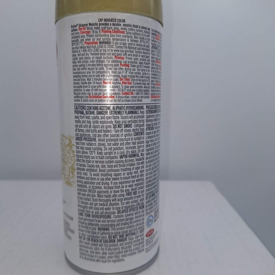The product is a Krylon Shimmer Metallic Gold Shimmer 3921 Spray Paint in an 11.5 oz size can. It is made in the United States and comes with 1 can of paint. Ideal for use in various crafting and art projects, this spray paint adds a metallic gold shimmer finish to surfaces. The Krylon brand ensures quality and reliability for your painting needs.