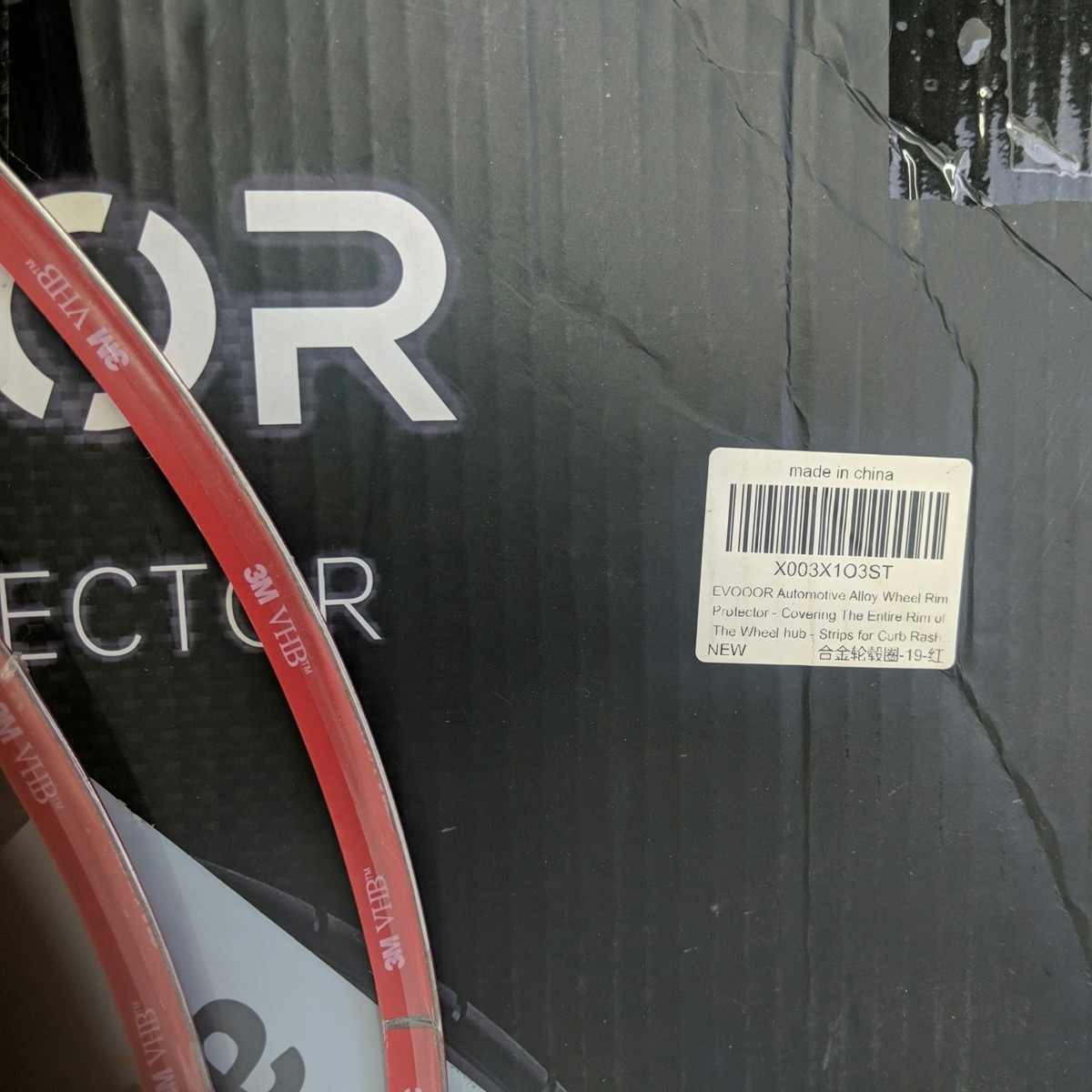 The product is a set of two 1/4 x 19 inch red self-adhesive alloy wheel hub rim trim guard strips designed for universal fitment on vehicles. Manufactured in China, these performance parts provide protection and decoration for your wheels. The California Prop 65 Warning indicates that the product may contain materials known to cause cancer and reproductive harm. Perfect for enhancing the look of your car's wheels while also serving a practical purpose.