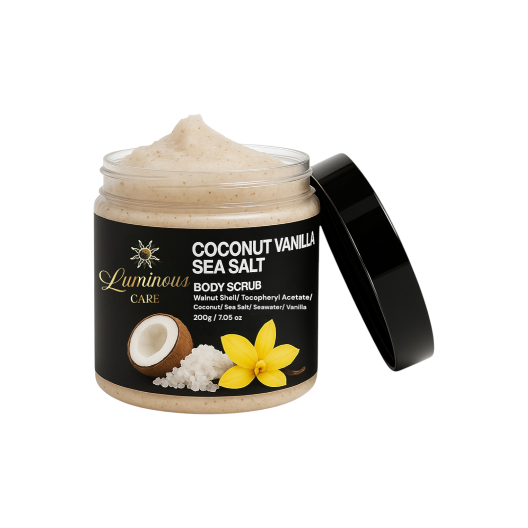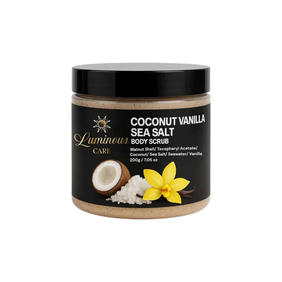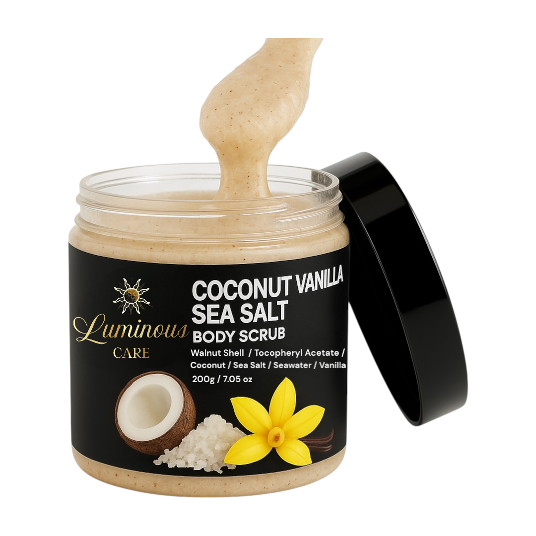 Indulge in smoother, more radiant skin with the Luminous Care Coconut Vanilla Sea Salt Walnut Shell Exfoliating Body Scrub (200 g / 7.05 oz jar). This vegan-friendly body polish combines mineral-rich sea salt, natural walnut shell powder, and antioxidant botanicals to gently buff away dead skin, hydrate deeply, and brighten tone. The whipped, ice-creamโlike texture makes exfoliation both effective and luxurious, while the warm coconut-vanilla scent turns every shower into a spa ritual.