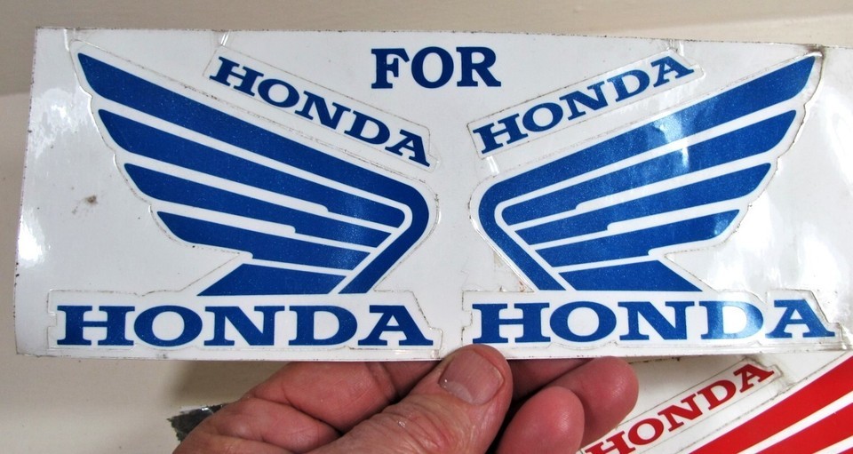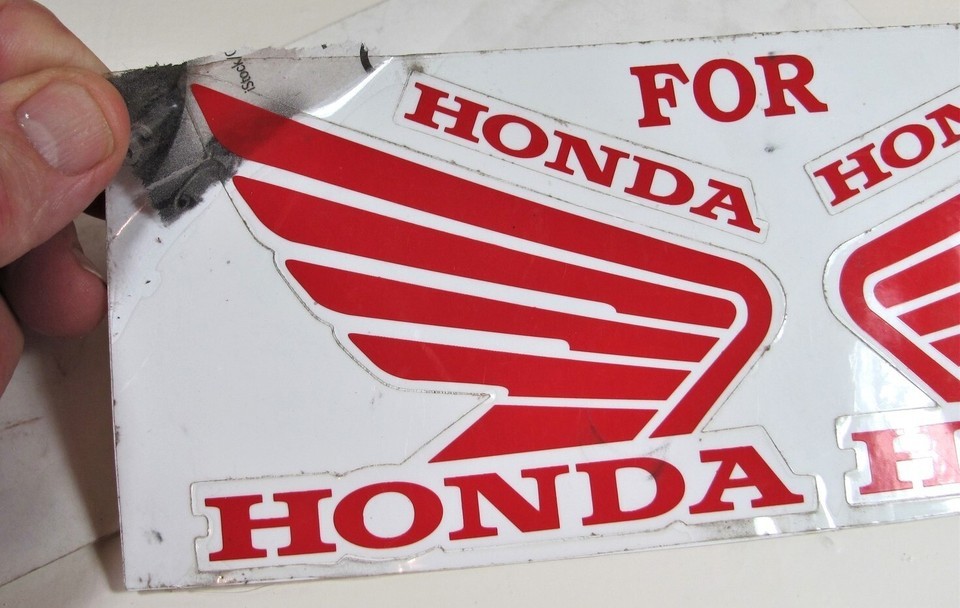 Up for sale is this set of vintage NOS Honda motorcycle vinyl decals. Good unused condition, one end of one of the red decals is pulled loose and has some paper stuck to the back of it.