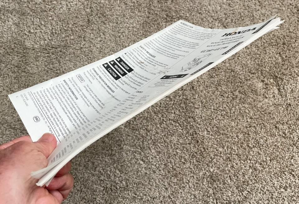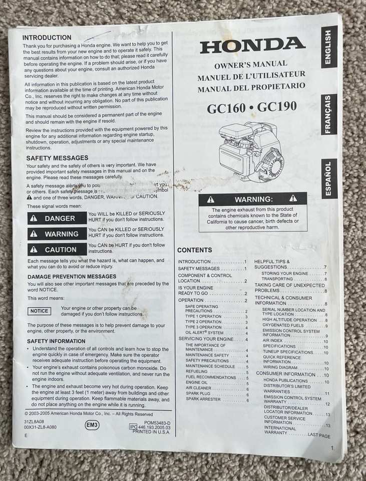Up for sale is this pre-owned owner's manual for the Honda GC0160 GC190 engine. Printed in English, Spanish and French.