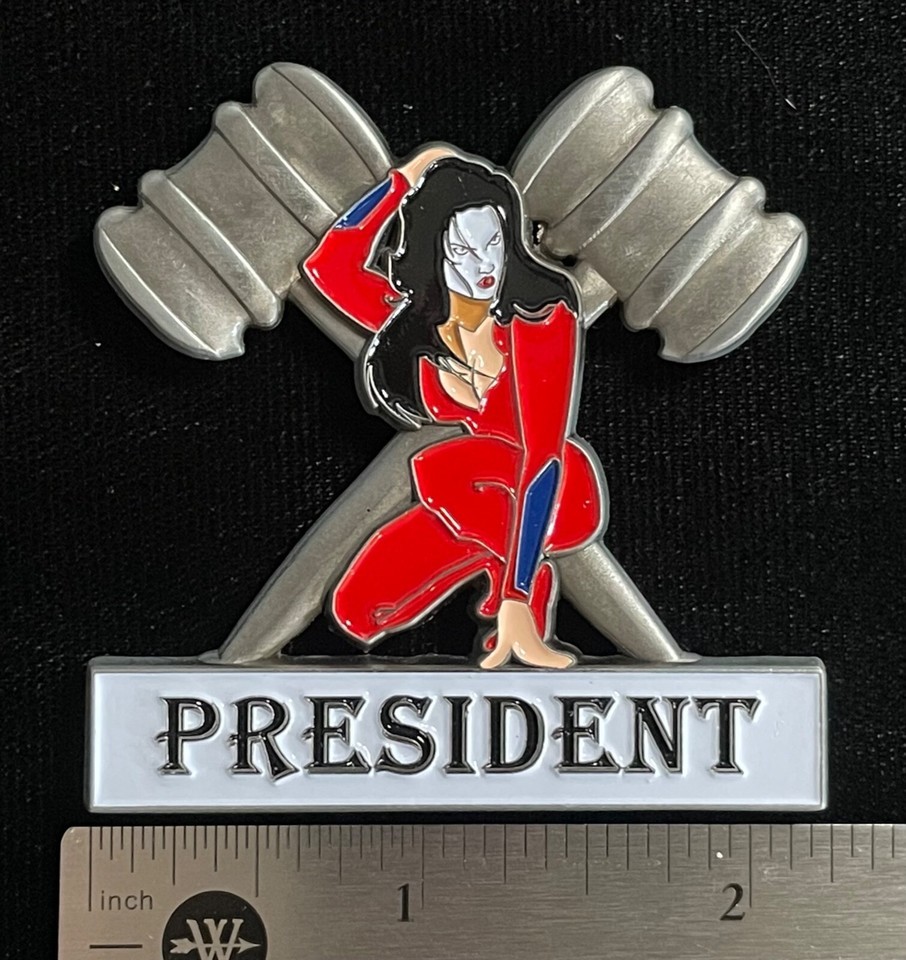 Widows Sons Masonic Riders Assn President Officer Pin, measuring in at 2 1/4 inches wide with double pinbacks.