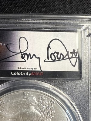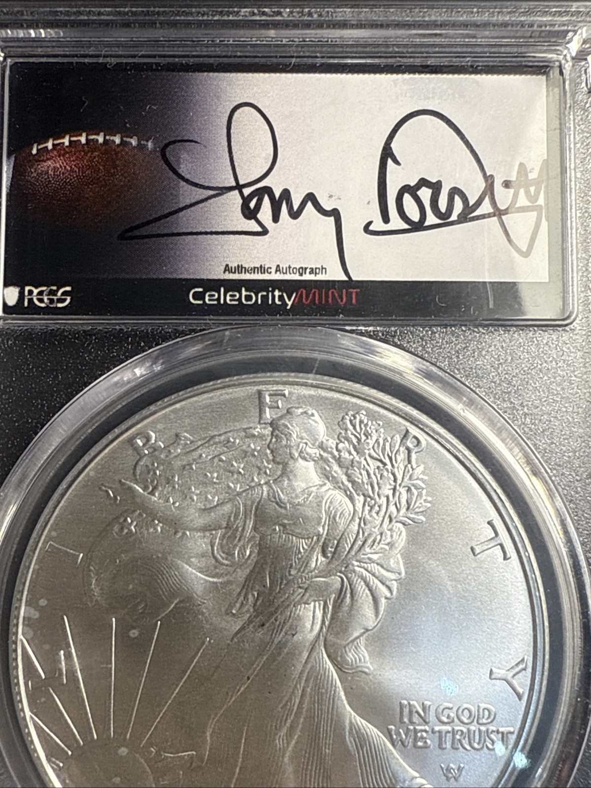 The product is a 2025 Silver Eagle coin with a grade of MS 70, certified by PCGS. It features a design signed by Tony Dorsett, adding a unique touch to this collectible piece. This coin is made of silver and is a valuable addition to any coin collection.