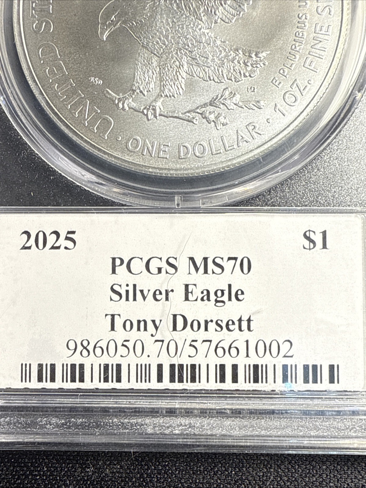 2025 SILVER EAGLE PCGS MS 70 SAIGNES BY TONY DORSETT