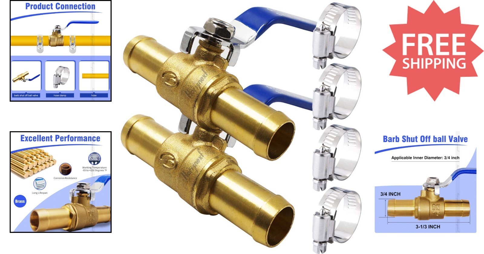 This heavy-duty brass valve set is versatile and durable, featuring 3/4 in. Hose ID barbs for secure connections. Designed for universal use, it is ideal for irrigation, piping, oil, and gas systems, suitable for both commercial and residential applications. Approved for underground and wall installations without access panels, it withstands temperatures from -39? to 380?. The package includes 2 valves and 4 stainless steel clamps, ensuring a reliable setup. To ensure fast and reliable delivery, we work with multiple fulfillment partners and suppliers. Depending on availability and location, your order may ship from different warehouses or arrive in packaging that varies from item to item. Tracking details are typically provided shortly after shipment, and customer satisfaction remains our top priority. Please note that due to carrier policies and regional regulations, certain items may not be eligible for delivery to specific states or territories.