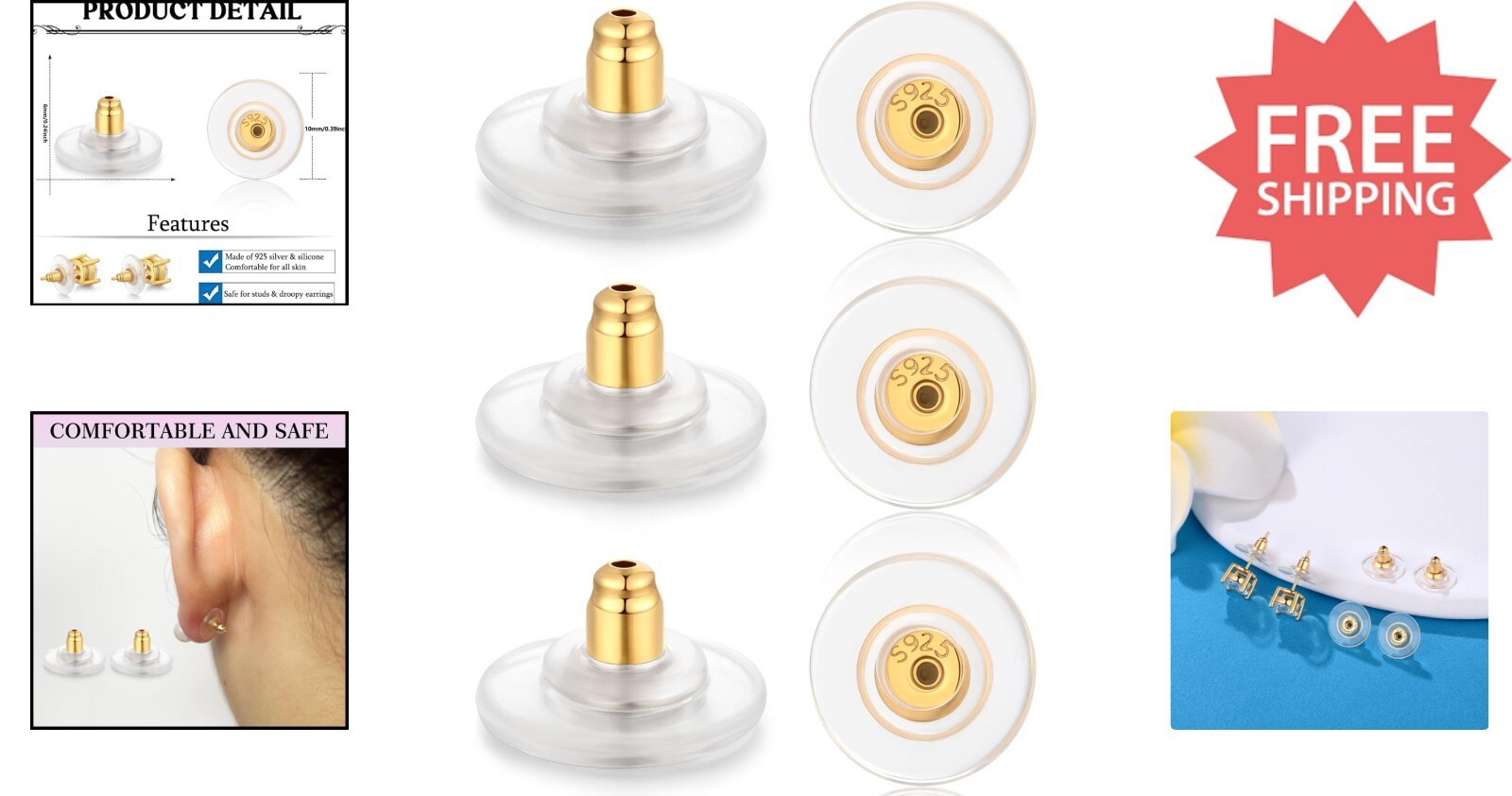 6PCS Gold Locking Earring Backs - 925 Sterling Silver for Heavy Earrings Comfort