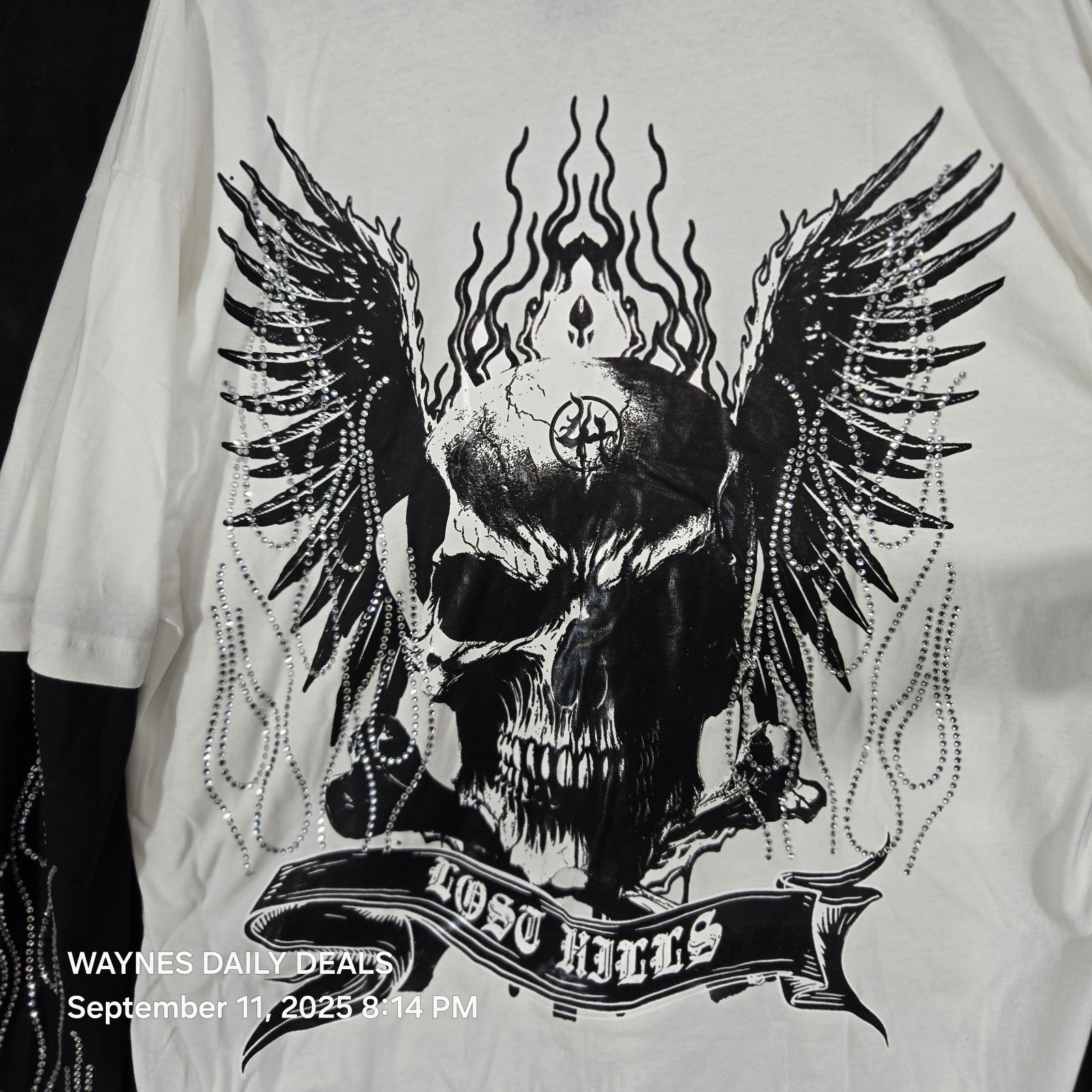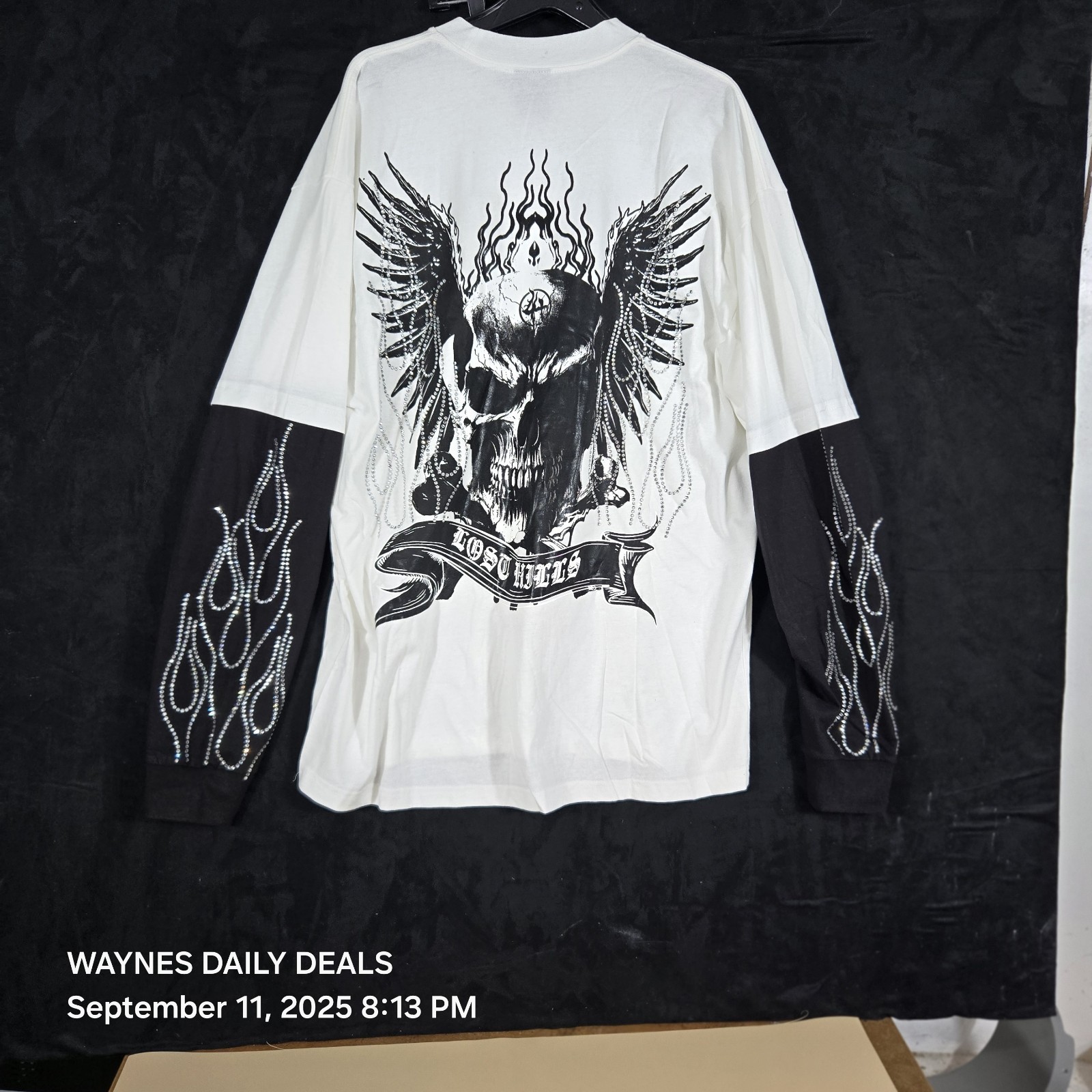 The Lost Hills long sleeve shirt is a stylish and eye-catching piece with rhinestones down the front and back, adding a touch of glamour to the design. This shirt is a size XL and features a multicolor fabric type with a regular fit, making it comfortable and fashionable for men. Perfect for those looking to make a statement with their clothing, this shirt is a unique and trendy addition to any wardrobe.