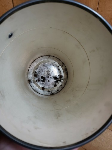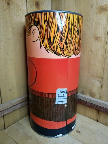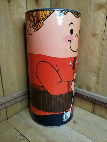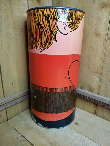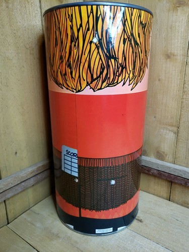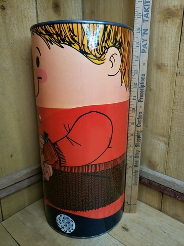 Trash can/storage container/umbrella holder. Container stands 16" tall and is 8" wide at opening. Container is in excellent vintage condition. The container is made of thick, sturdy cardboard stock body. The bottom is made of metal. There is a very small amount of surface rust on bottom. Please view pictures closely