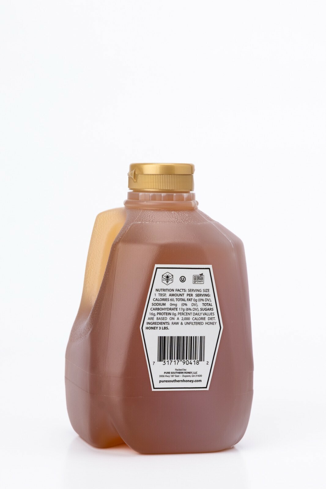 Pure Southern Honey is 100% raw, unfiltered, and never heated. This wholesome honey derives from a range of floral sources native to Southeast Georgia, consisting of mainly Gallberry with some Tupelo, Blackgum, and Palmetto flowers. It is unique in its natural flavor and that it does not crystallize quickly, giving itself a longer shelf life compared to average honey?s. Our three pound carton is packaged in a handy pour jug with flip top.
