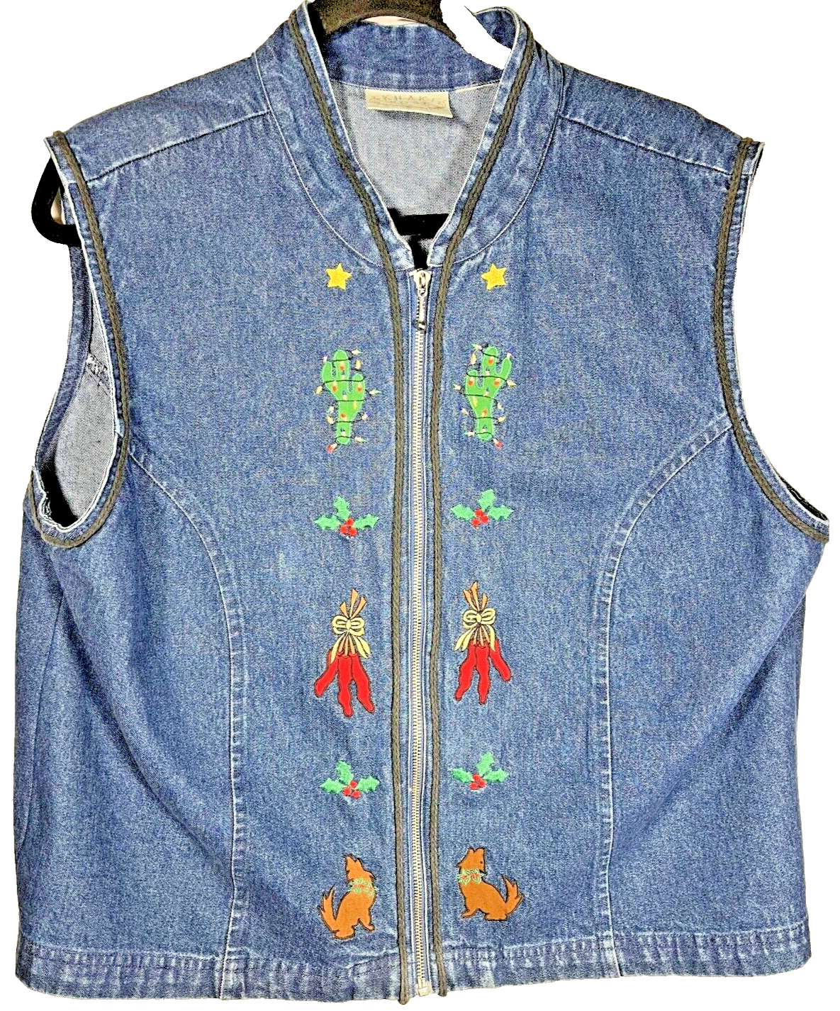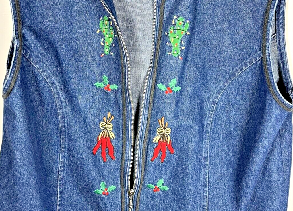 Khaki Rose Lady Size L Denim Vest Blue Embroidered V Neck Christmas