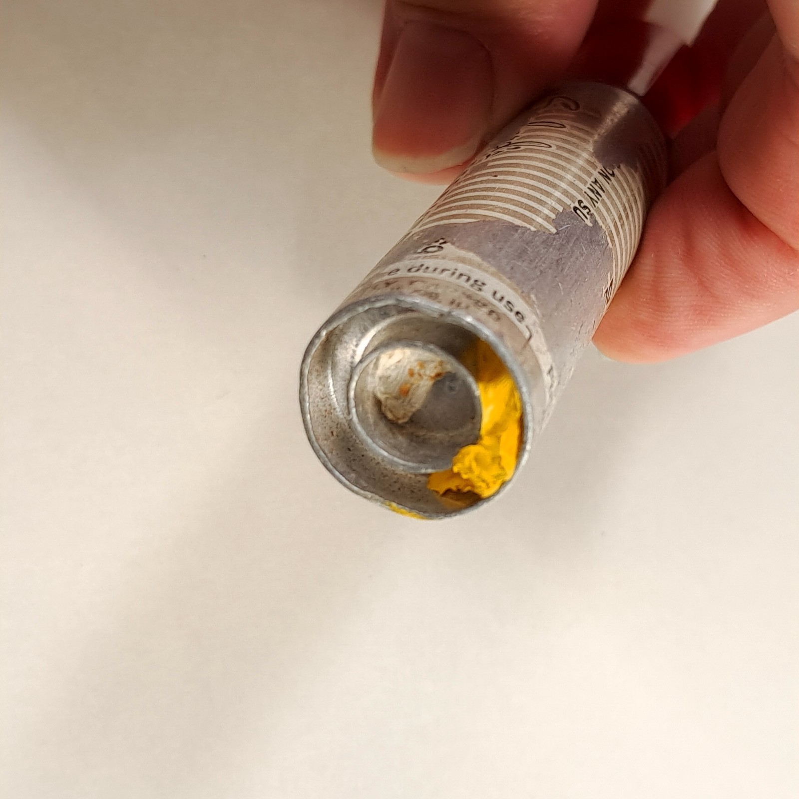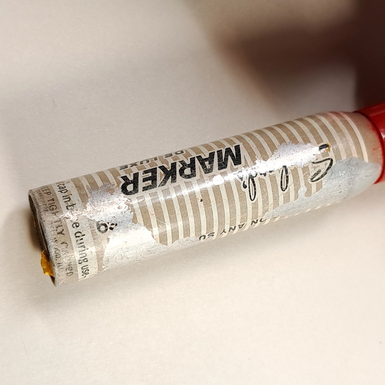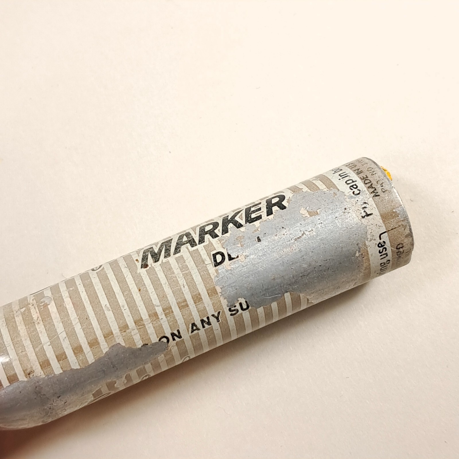 Smaller size. Metal barrel. Graphic wear and something yellow(Paint?) stuck to the bottom of the marker as shown. Still very potent smelling.
