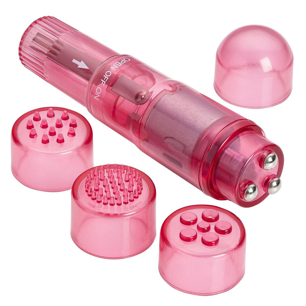 Vibrator requires 1 AA battery, not included. Always clean before and after use. Bonus mini massager also includes 4 interchangeable massage heads for stimulation. Battery, not included. Bulk non retail package for e-commerce shipment. Includes 1 Mini Massager and 4 Massager Heads Material: ABS plastic. Waterproof vibrations. Size approximately: 4 inches in length by 1 inch in width. 1.72 ounces. 4 interchangeable tips with unique textures. Lightweight and easy to use. Great for travel.