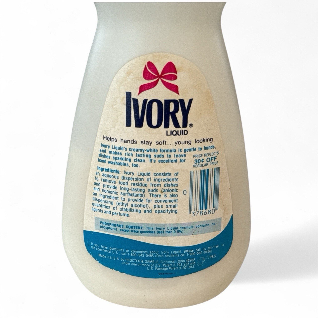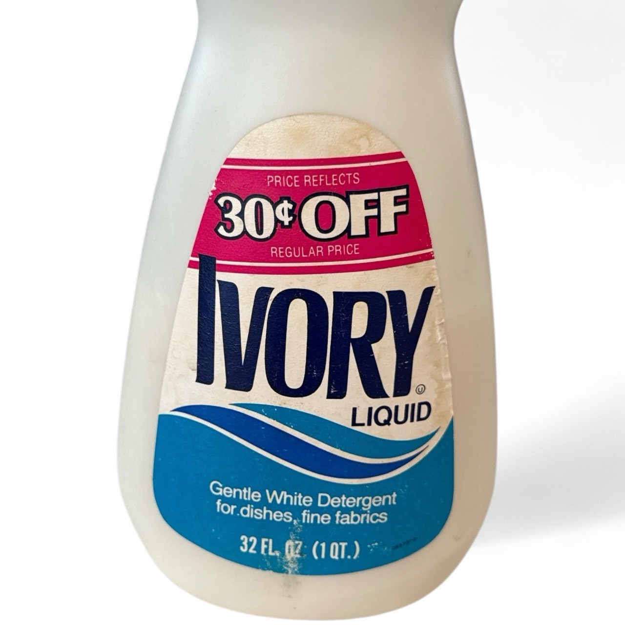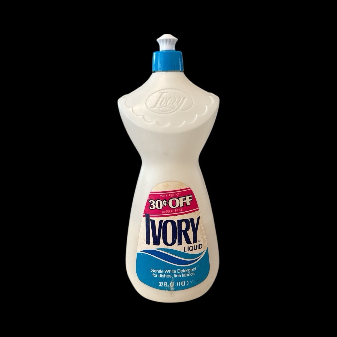 The product is a vintage Ivory liquid detergent dish soap bottle, featuring a nostalgic design and theme related to soap and detergent. This original collectible advertising piece was manufactured in the United States. With a brand known for quality and a large 32 oz size, this item is a unique addition to any household or vintage memorabilia collection.
