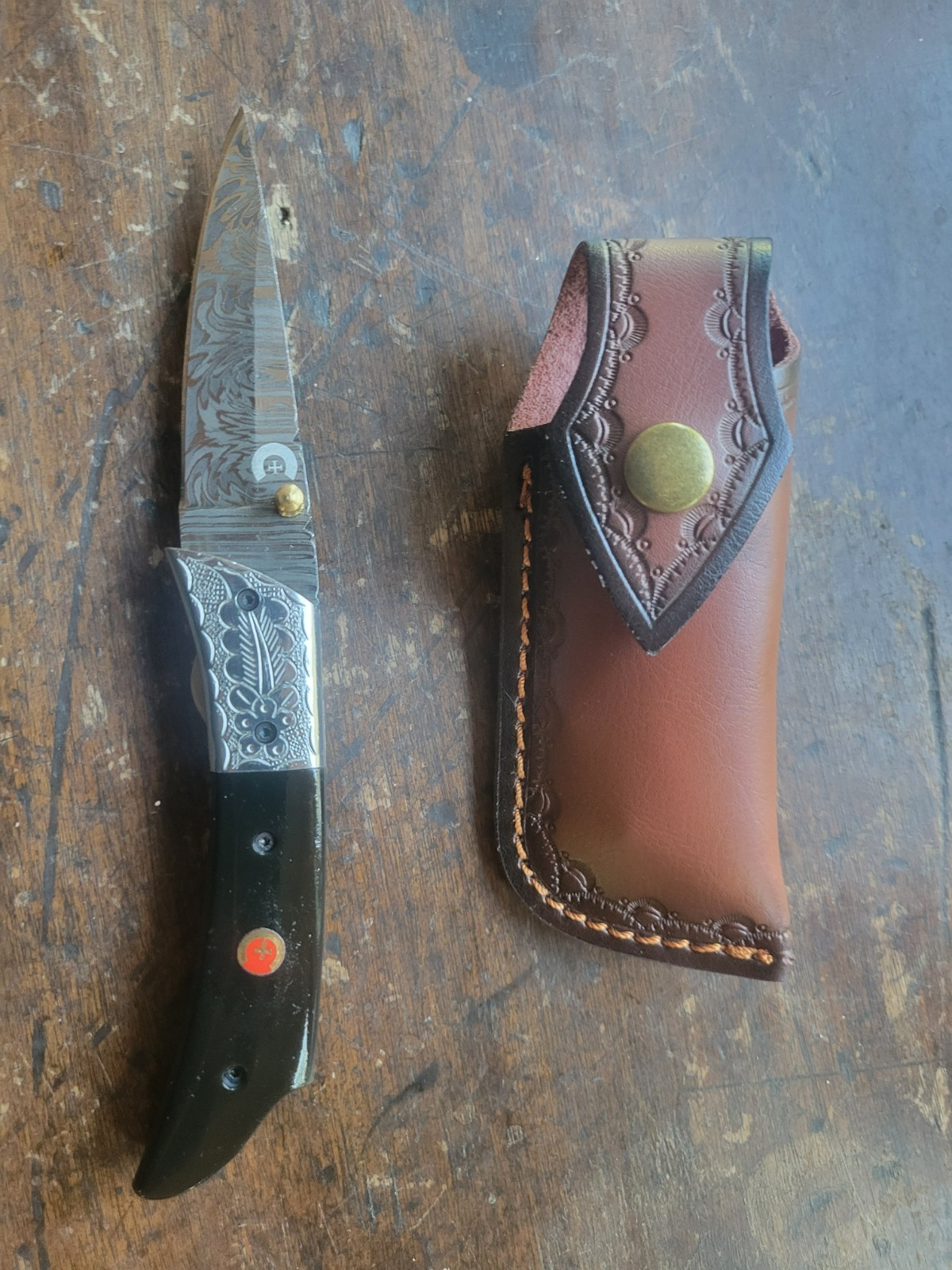 Damascus Steel C+ Logo Pocket Folding Knife 6 Inch Dark Wood Handle w/ Sheath