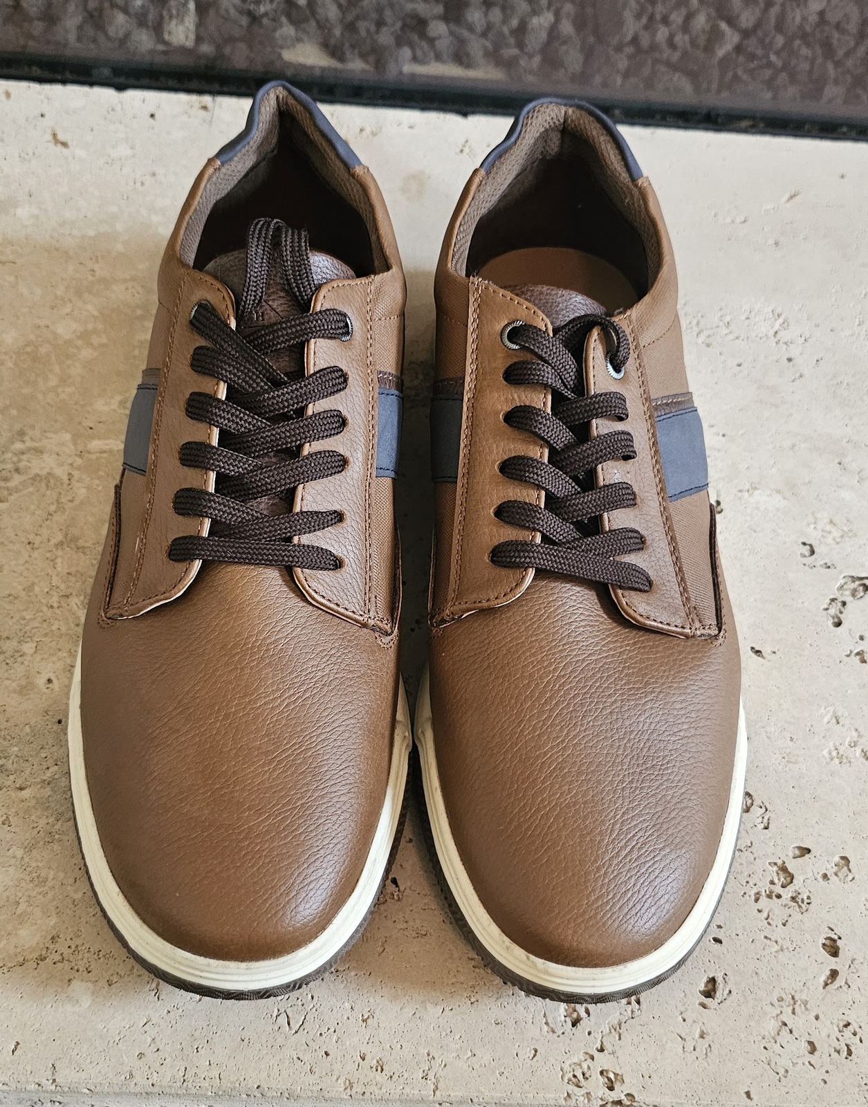 closure, and a white sole. The color is a brown tone, with a navy or dark blue accent