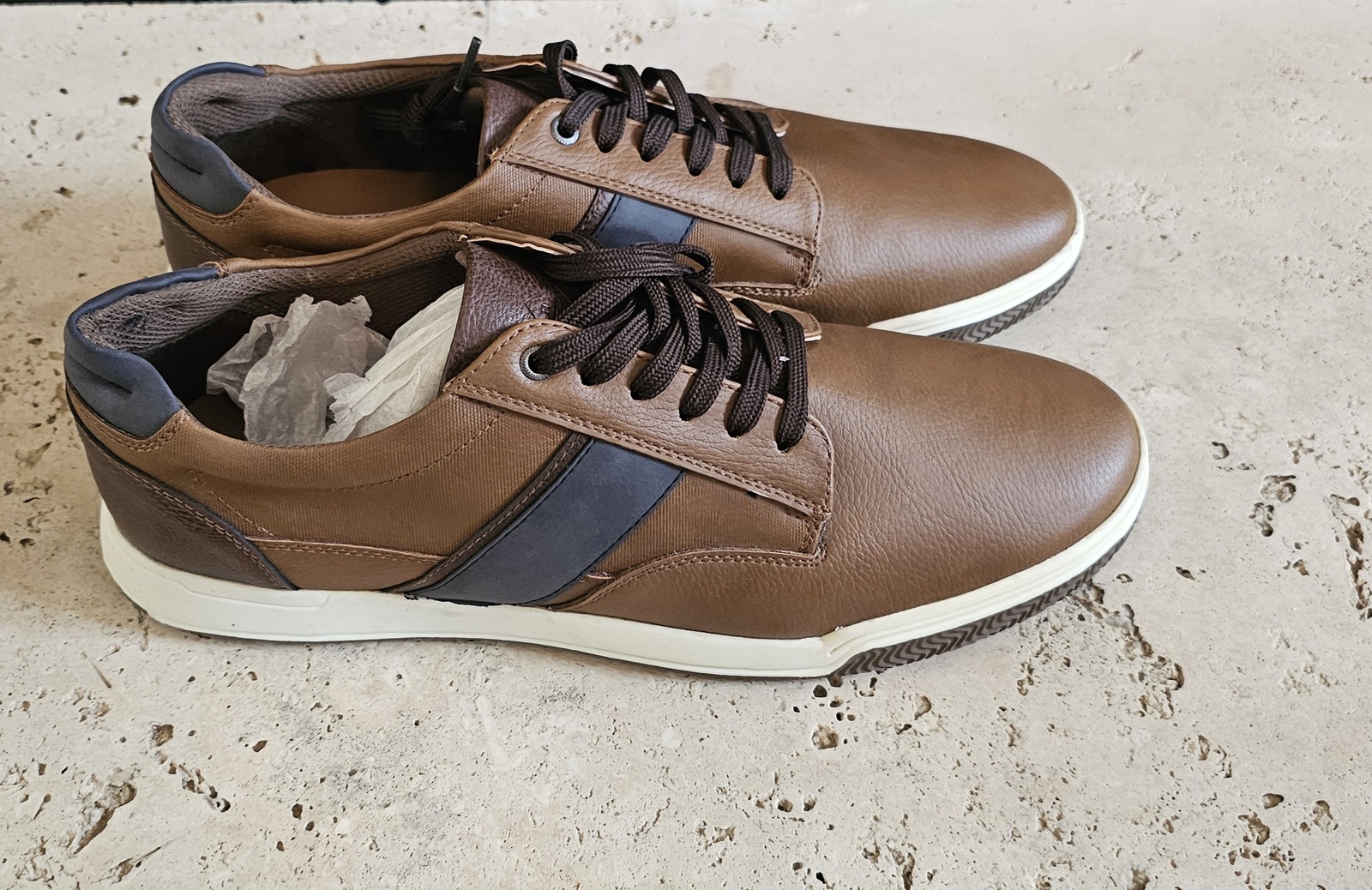 The shoes are a low-top sneaker style with a faux leather upper, lace-up