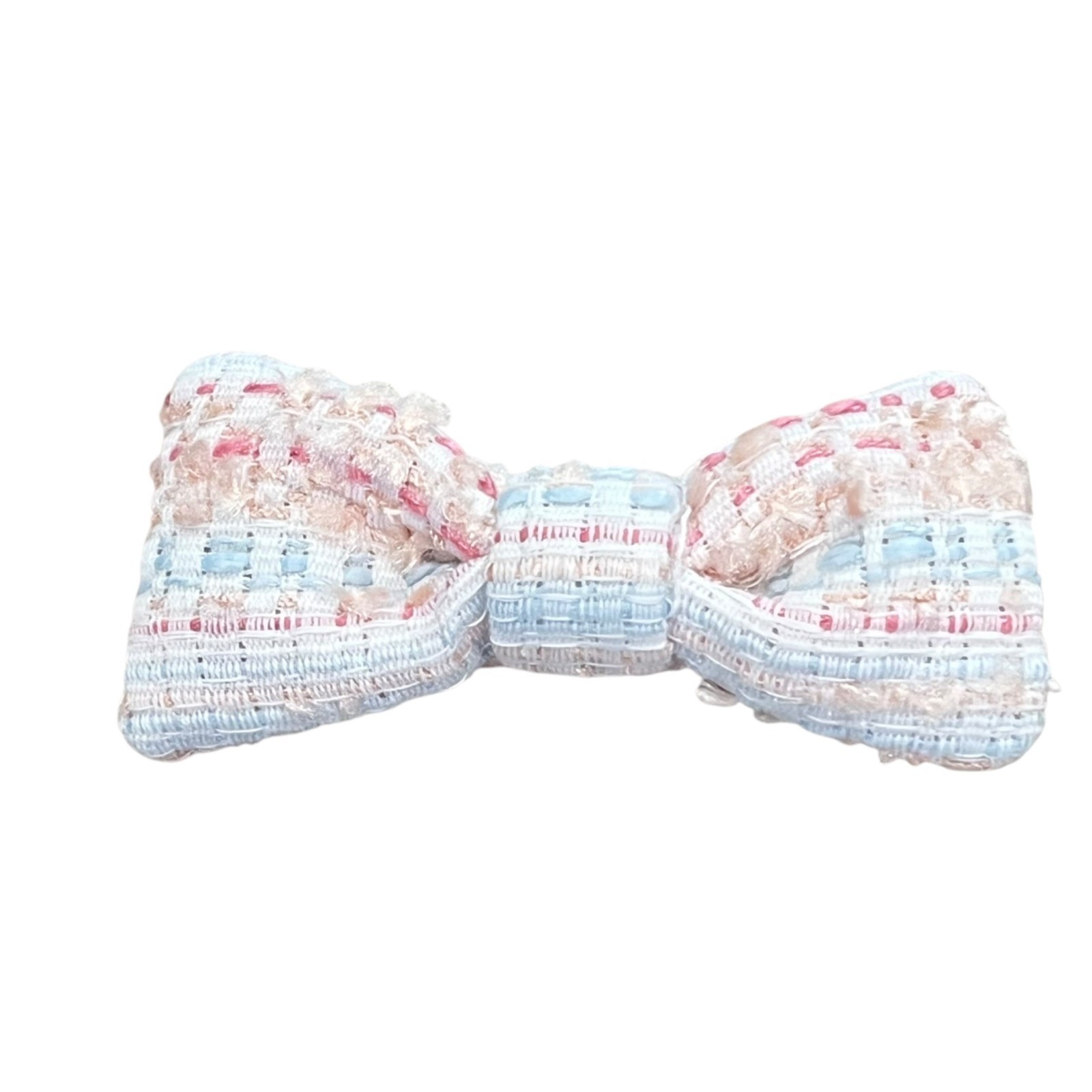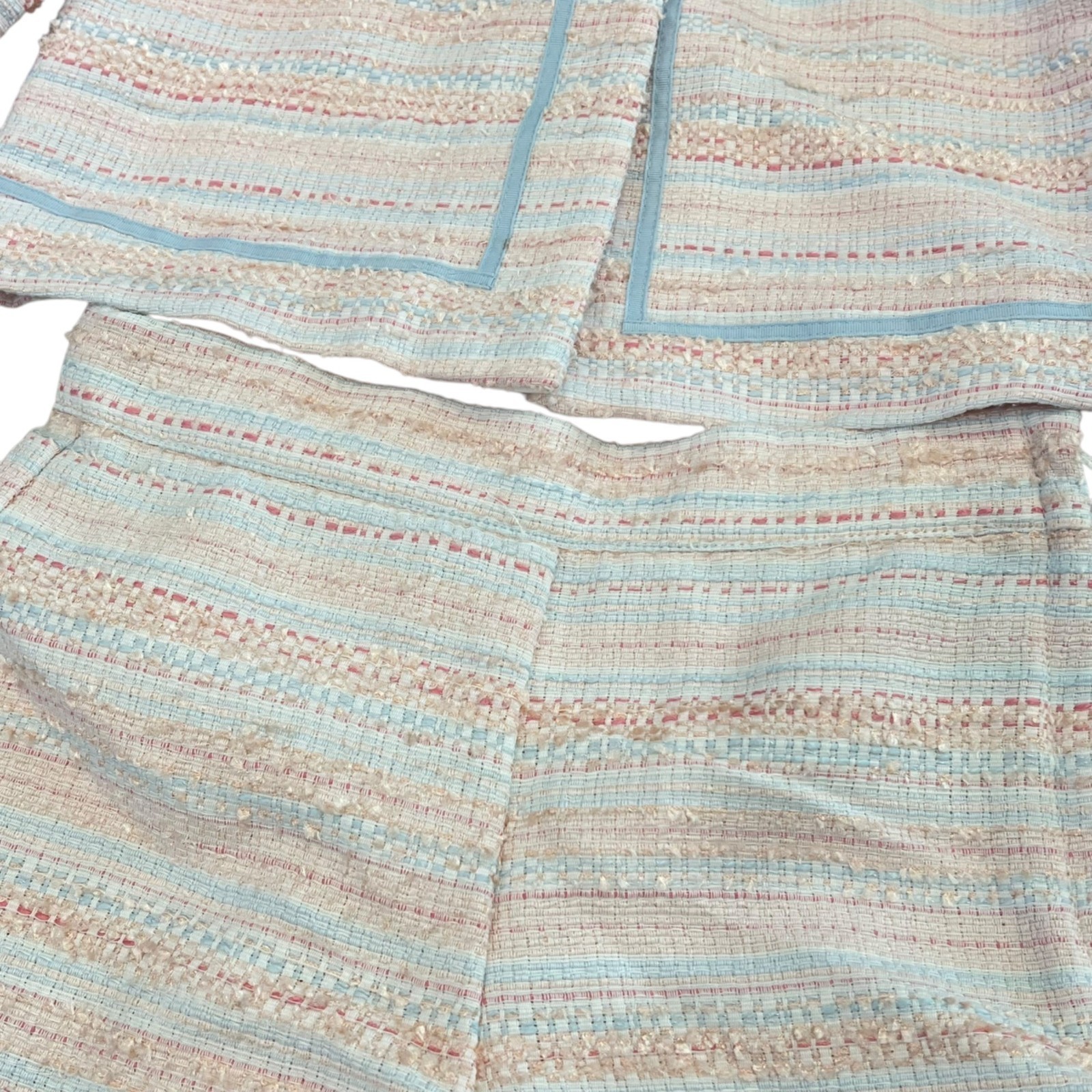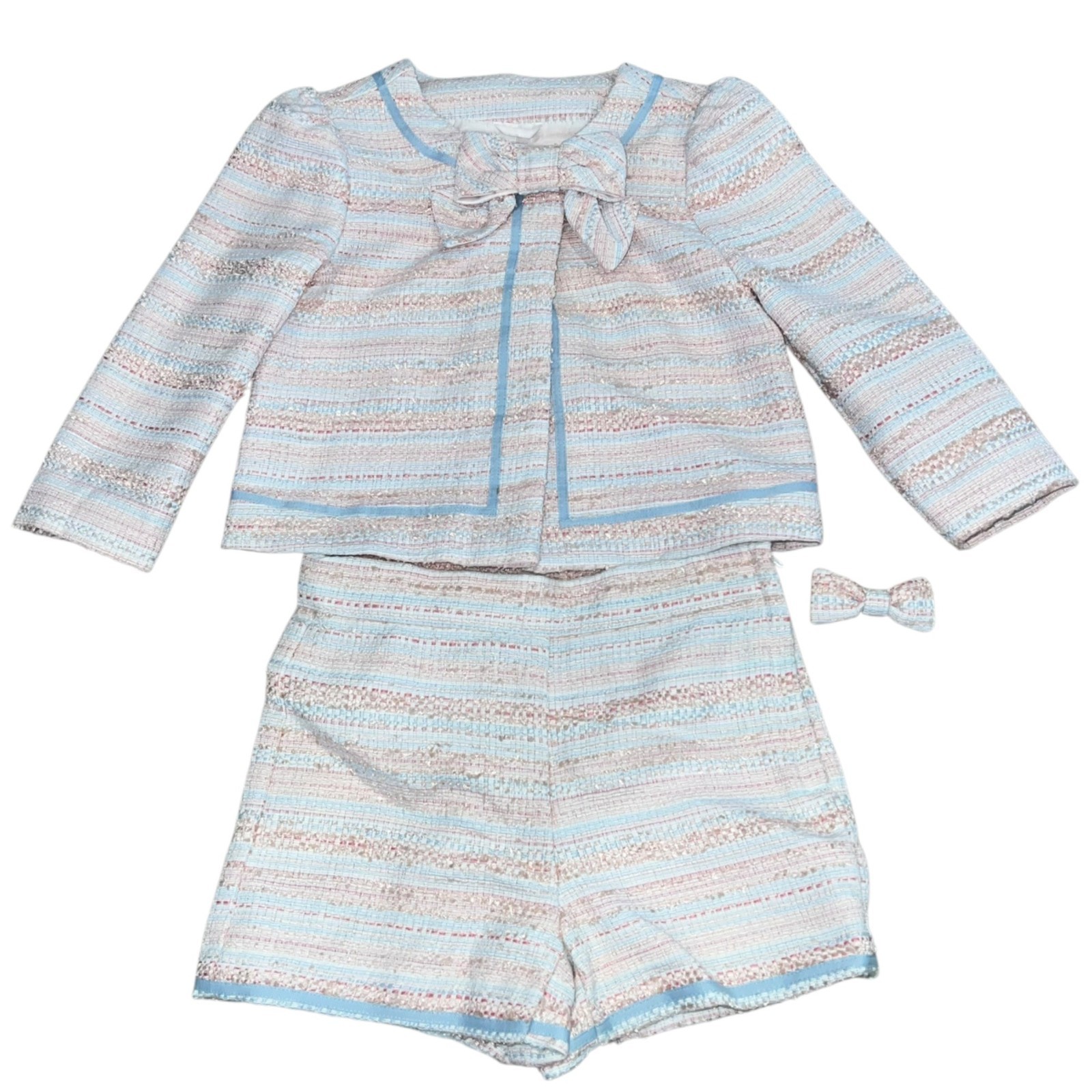 Chic tweed-patterned outfit featuring a bow-accented jacket and matching shorts. Perfect for stylish occasions or adding charm to everyday wear.
